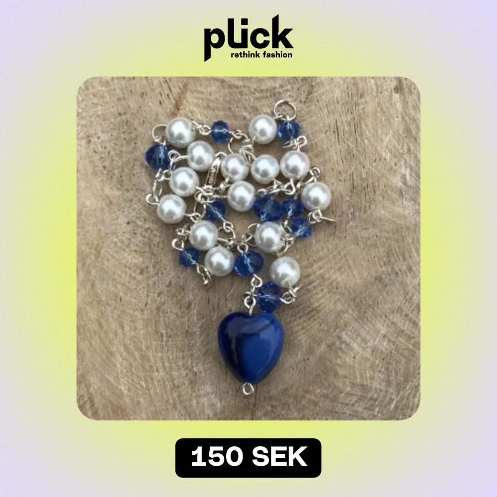 Handgjort vitt och blått halsband med ett blått glashjärta 💙