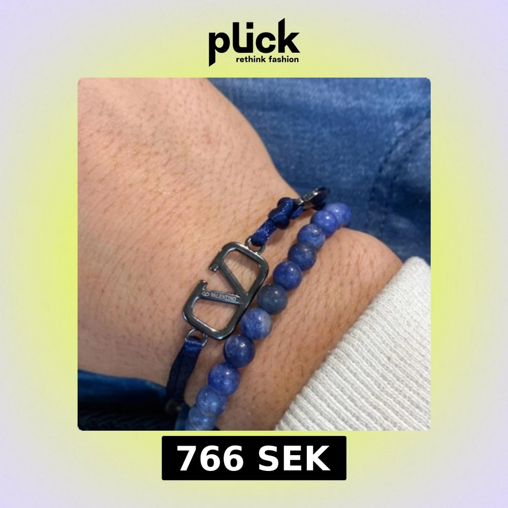 Snyggt armband från Valentino med blå snöre och en metallfärgad V-logga. Kombinerat med ett pärlarmband i blå toner som ger en cool och modern vibe. Perfekt för dig som gillar stilrena accessoarer med designer-touch.