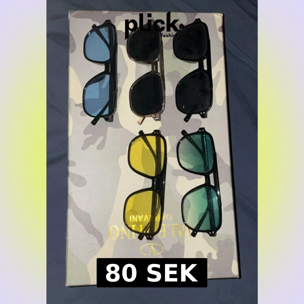 Säljer ett set med fem rektangulära solglasögon i olika färger: blå, svart, gul och grön. Alla har svarta bågar och coola färgade linser som ger en unik vibe till din stil. Perfekt för att sticka ut och matcha med olika outfits.