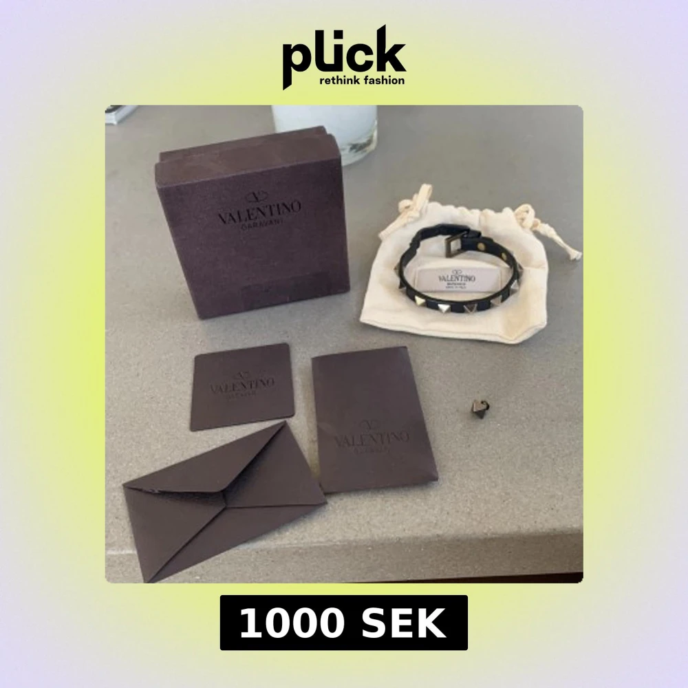 Snyggt svart armband från Valentino Garavani i äkta skinn med ikoniska silverfärgade pyramidnitar runt om. Spännet är fyrkantigt i metall med Valentino-logga. Perfekt accessoar för att lyfta din outfit med en edgy touch.