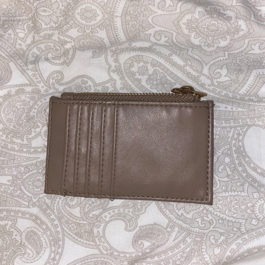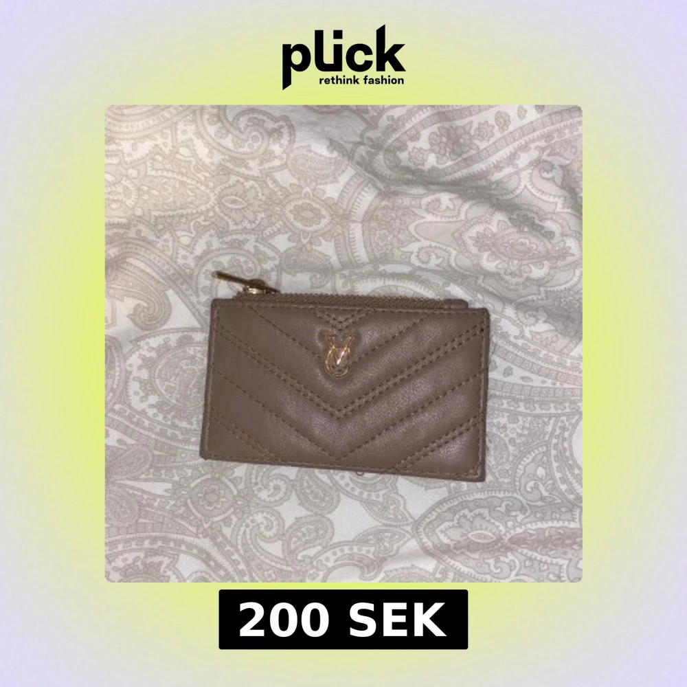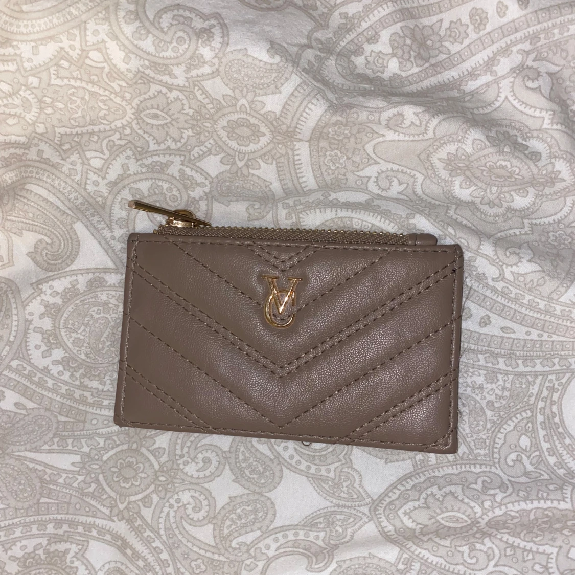 Snygg beige plånbok i quiltat skinn med guldfärgad logga framtill. Plånboken har dragkedja upptill och flera kortfack på baksidan. Perfekt storlek för att ha med sig överallt och håller dina kort och kontanter organiserade.
