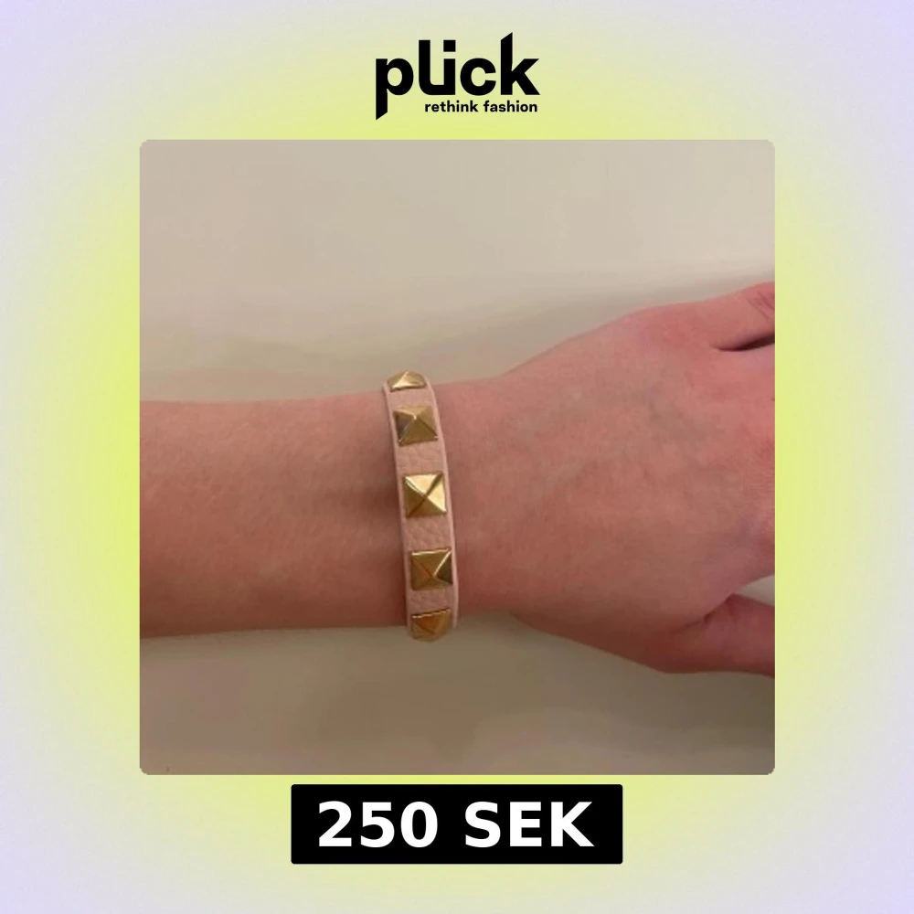 Säljer ett ljusrosa armband i läderimitation med stora fyrkantiga guldnitar. Armbandet har spänne i guld och justerbar längd. Perfekt accessoar för att ge din outfit en edgy touch.