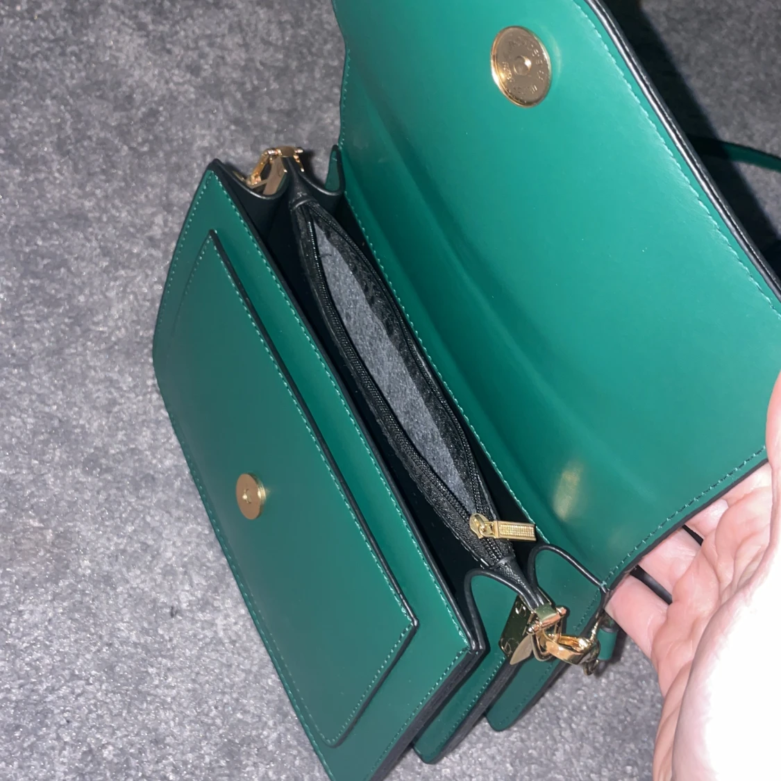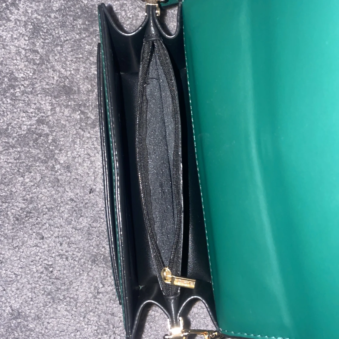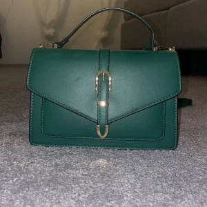 Grön axelväska med tre fack, i princip oanvänd.