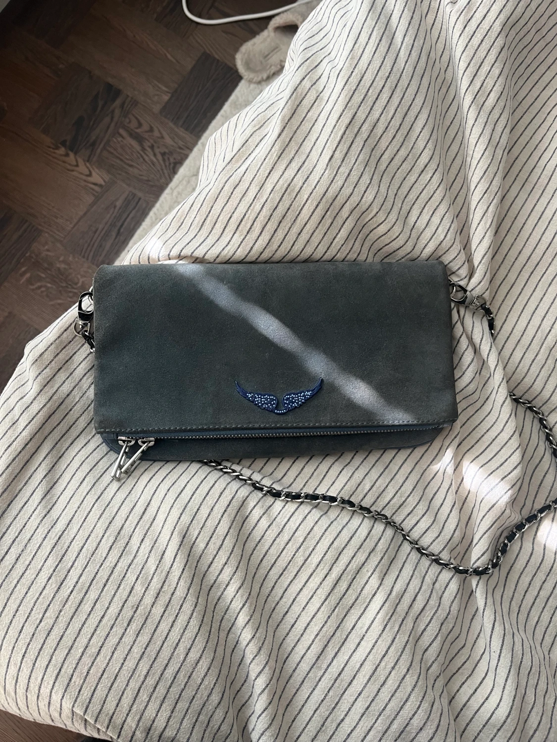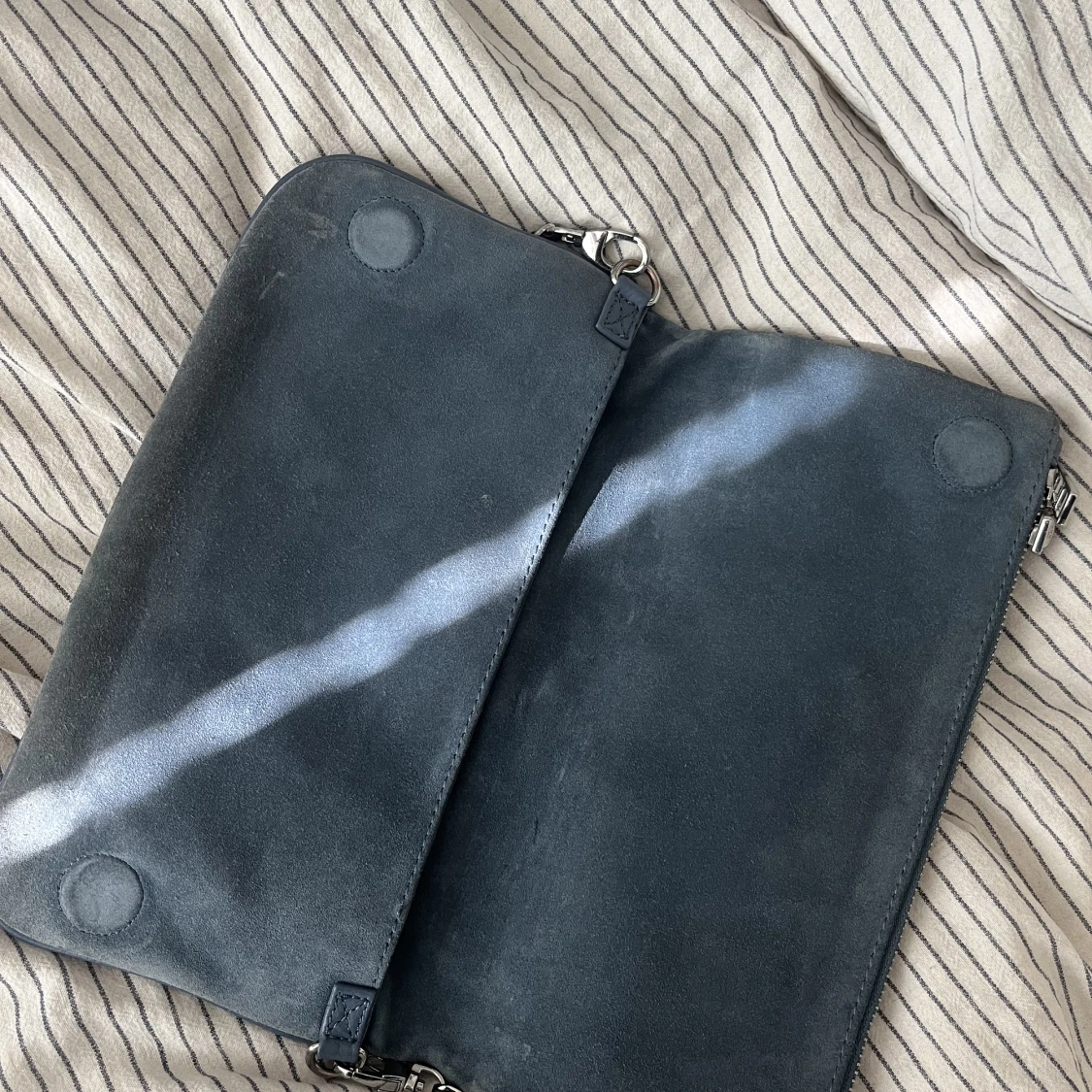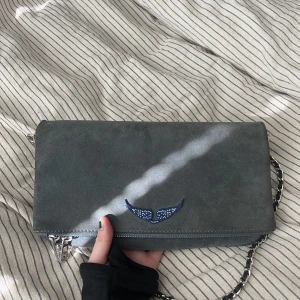 Väskan är i mocka och två olika längd på kedjor är med i priset. Kedjorna har inget slitage. Väskan har lite missfärgning men inget som man tänker på , därav lite lägre pris!