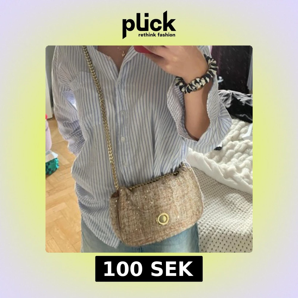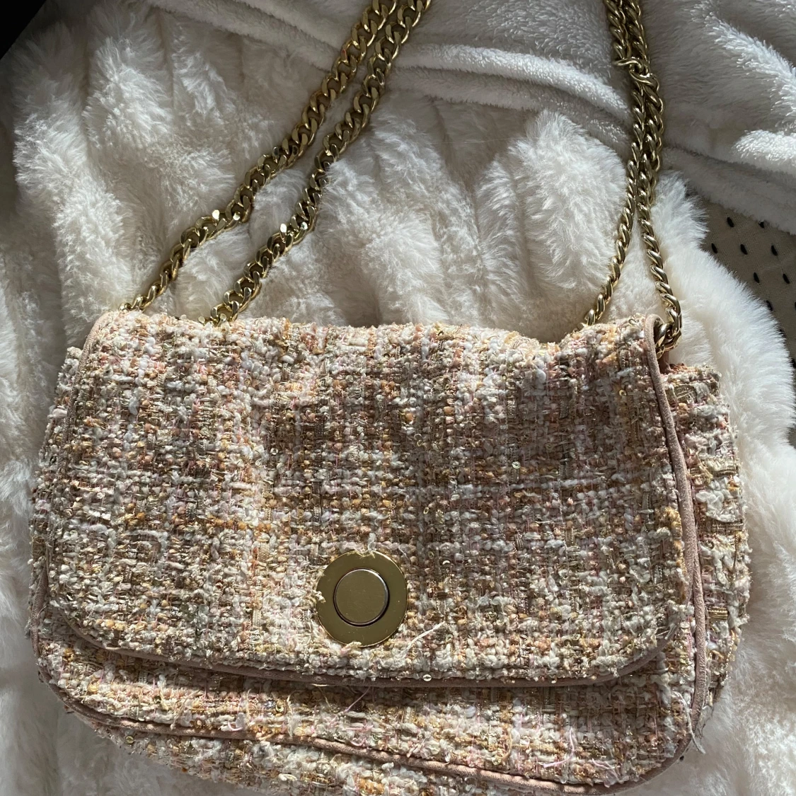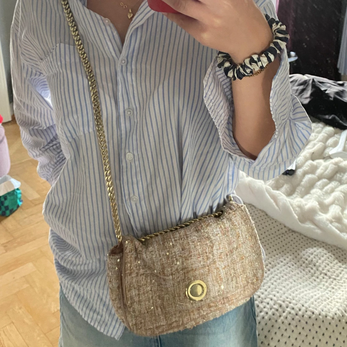 En söt liten väska från zara i tygmaterial med guldkedja o gulddetaljer! Köpt för några årsedan. Fortfarande fint skick kan vara lite färgslitningar på kedjan o knappen som man stänger väskan med!