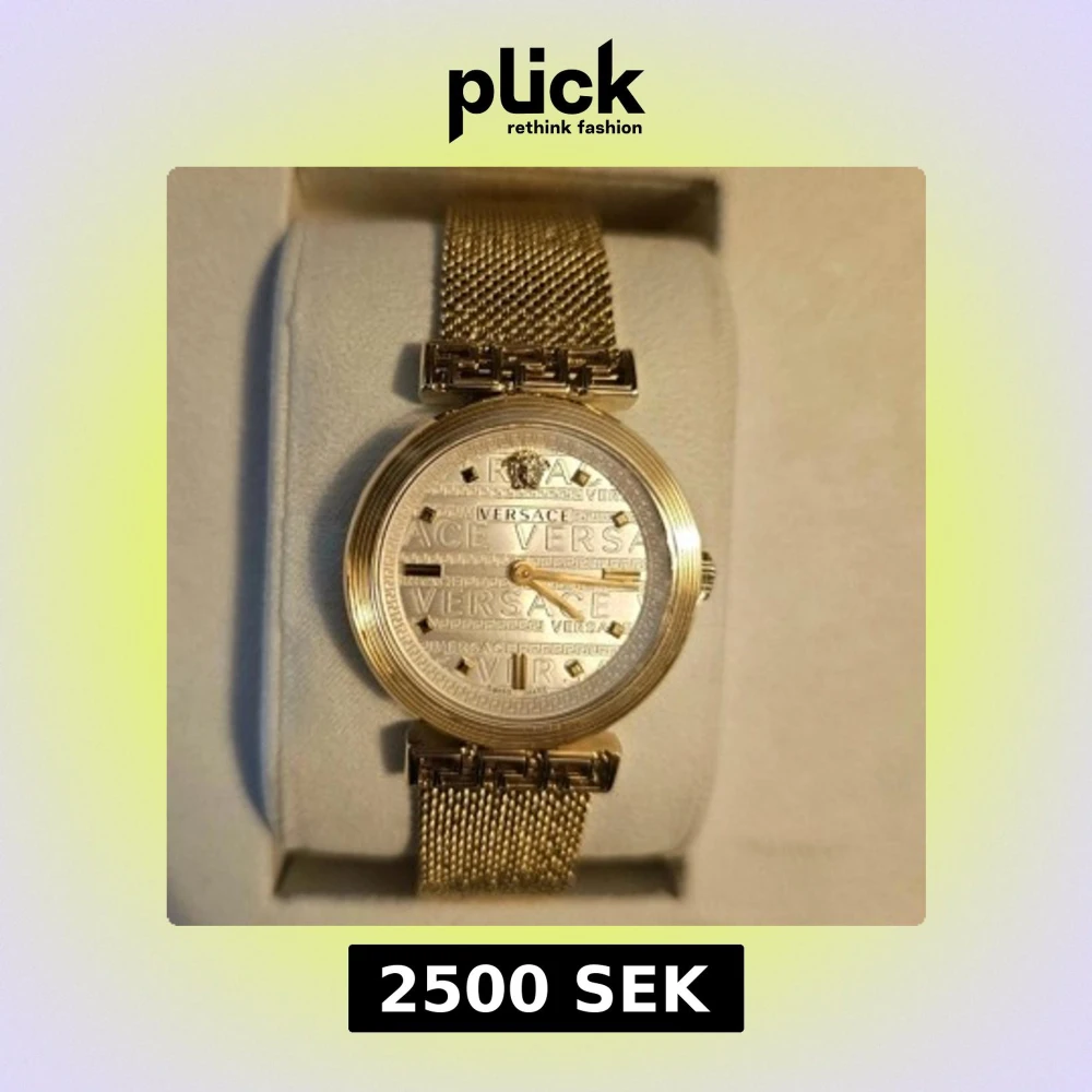 Elegant guldfärgad klocka från Versace med ett detaljerat mönster på urtavlan och ett stilrent mesh-armband. Klockan har en rund boett och tydliga Versace-logotyper på urtavlan. Perfekt för den som vill ha en lyxig accessoar.
