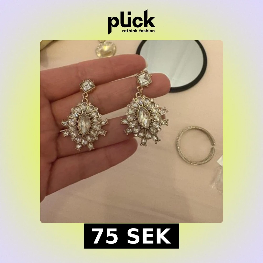 Säljer ett par statement örhängen i guldton med massor av gnistrande klara kristaller. De har en unik, blomliknande form med en stor avlång kristall i mitten och mindre stenar runtom. Perfekta för dig som vill sticka ut och glänsa extra mycket.