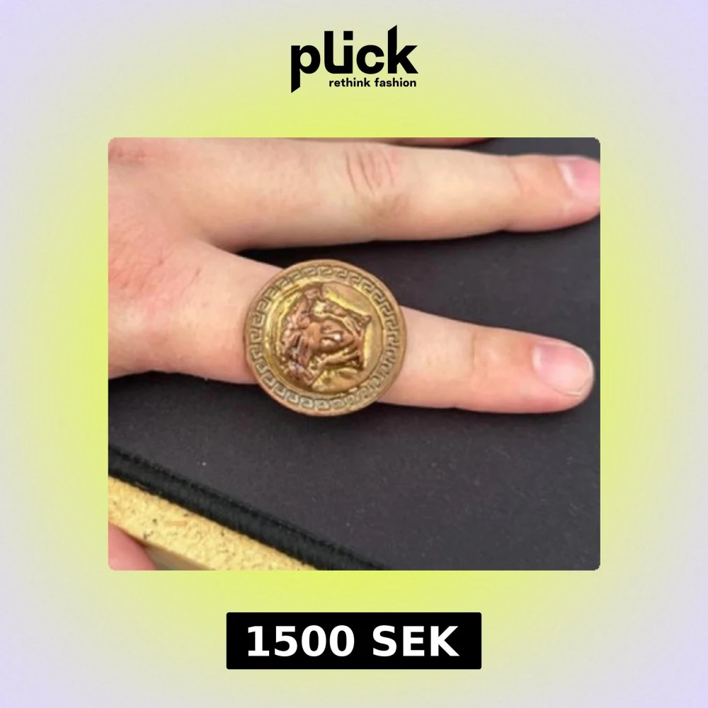 Cool statementring i guldfärg med rund form och ett detaljerat Medusa-motiv i relief. Ringen har en bred front med klassiskt grekiskt mönster runt kanten och är perfekt för dig som gillar unika accessoarer med antik vibe. Den är gjord i koppar och guld blandning vid snabb affär kan priset diskuteras