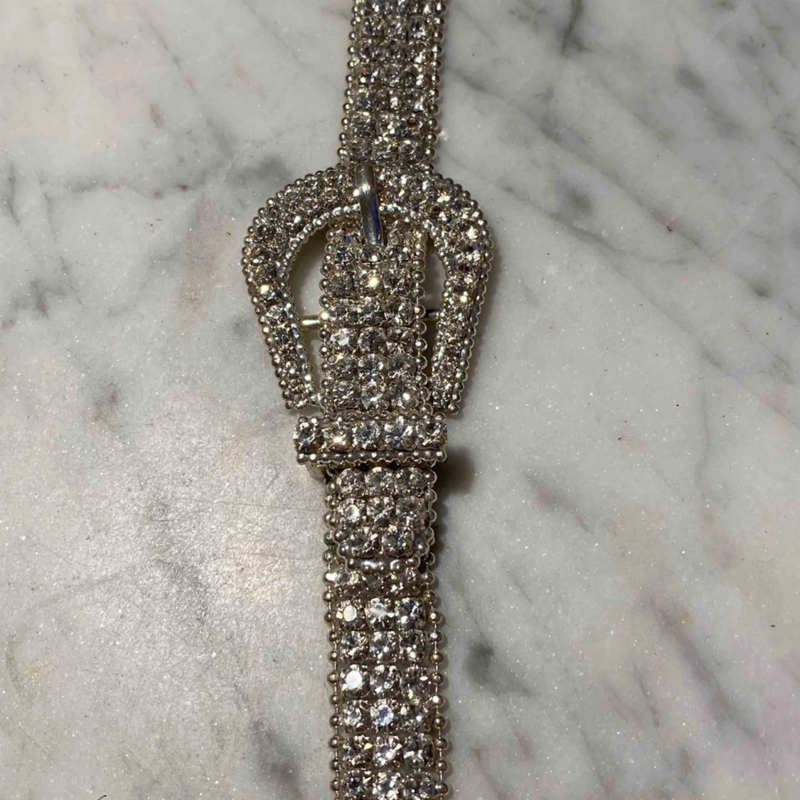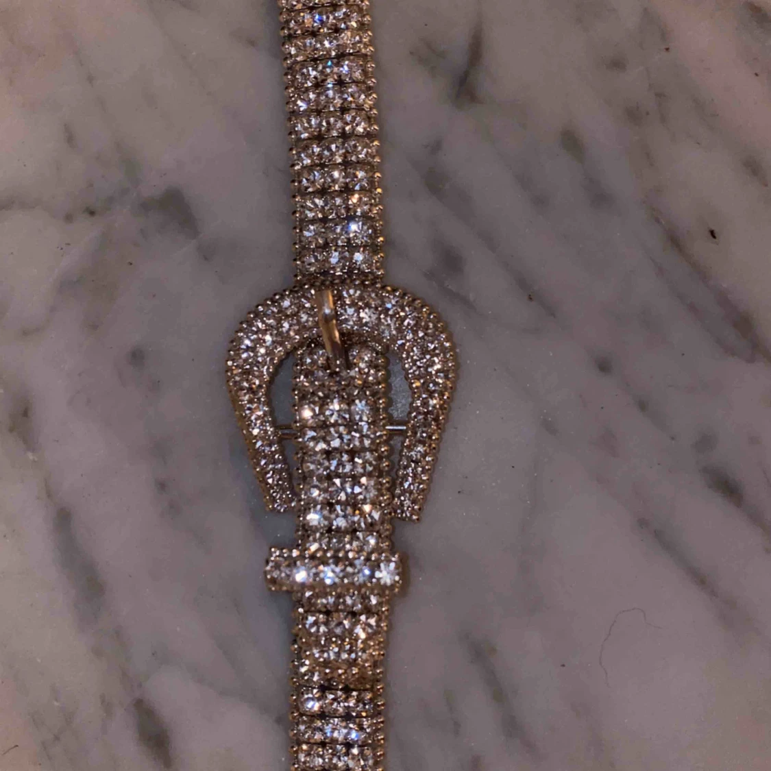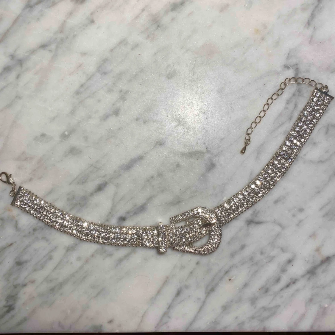 Choker med stenar och justerbar storlek. Den har stenar över hela halsbandet runt halsen och glittrar jättefilt!