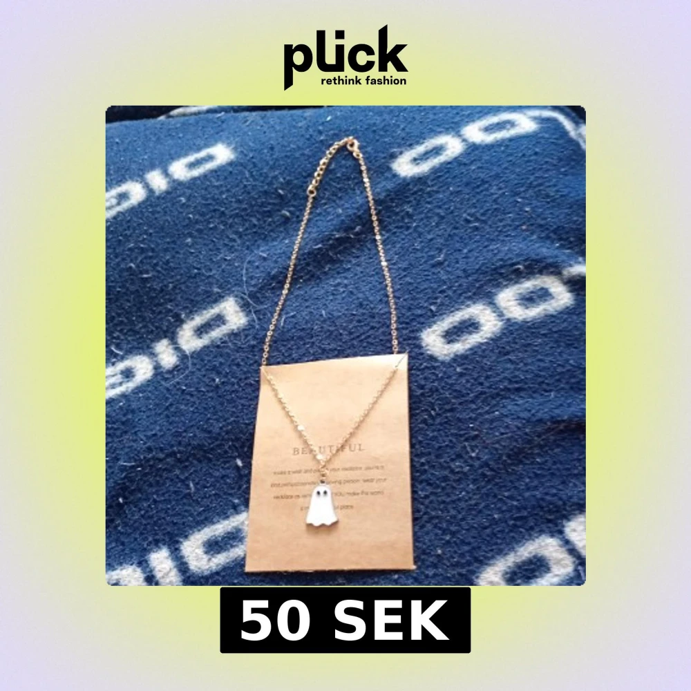 Snyggt halsband med tunn guldfärgad kedja och ett vitt spökhänge med svarta ögon. Perfekt accessoar för dig som gillar unika och lekfulla smycken. Kedjan är enkel och klassisk medan hänget ger en cool twist.