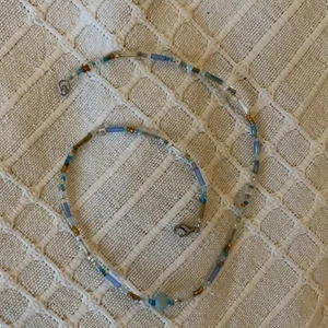 Halsband med blå/ bruna pärlor och en ljusblå sötvattenspärla