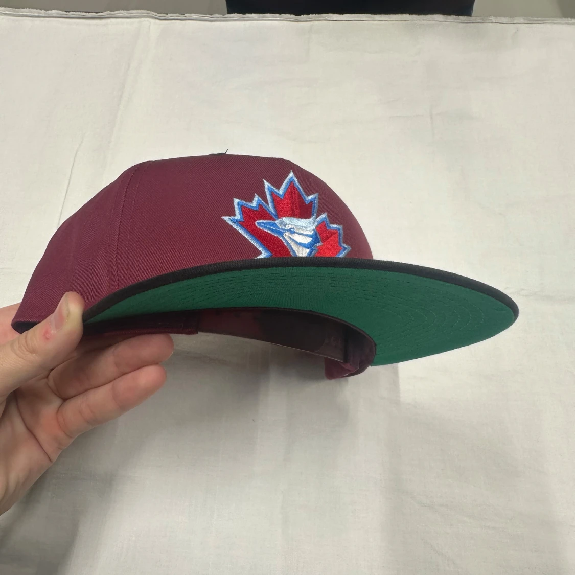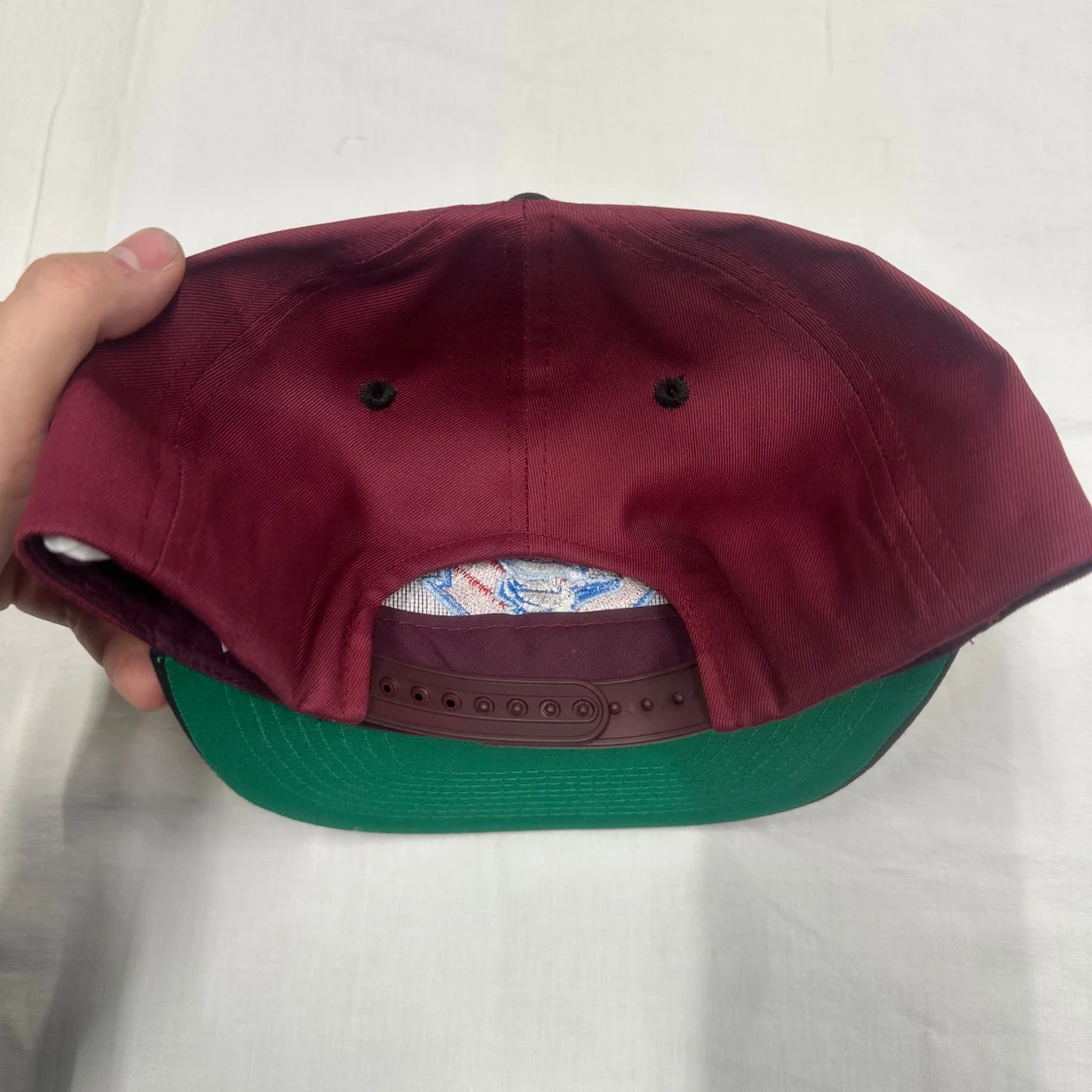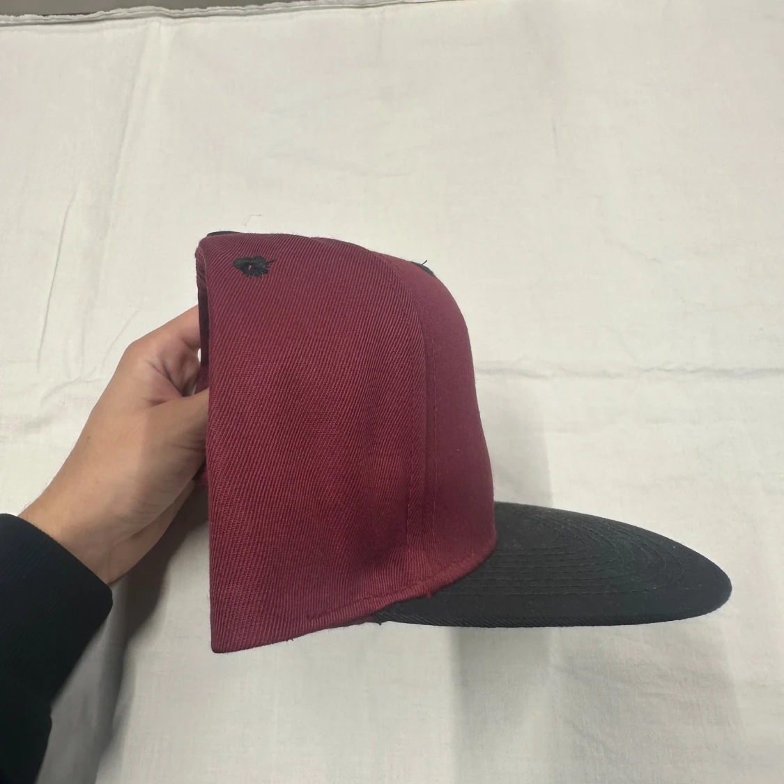 Snygg vinröd snapback keps med svart skärm och grönt under visiret. Framtill finns ett broderat motiv med ett rött lönnlöv och blå detaljer. Justerbar baktill med klassisk snapback-spänne. Perfekt för dig som vill sticka ut med en unik keps.