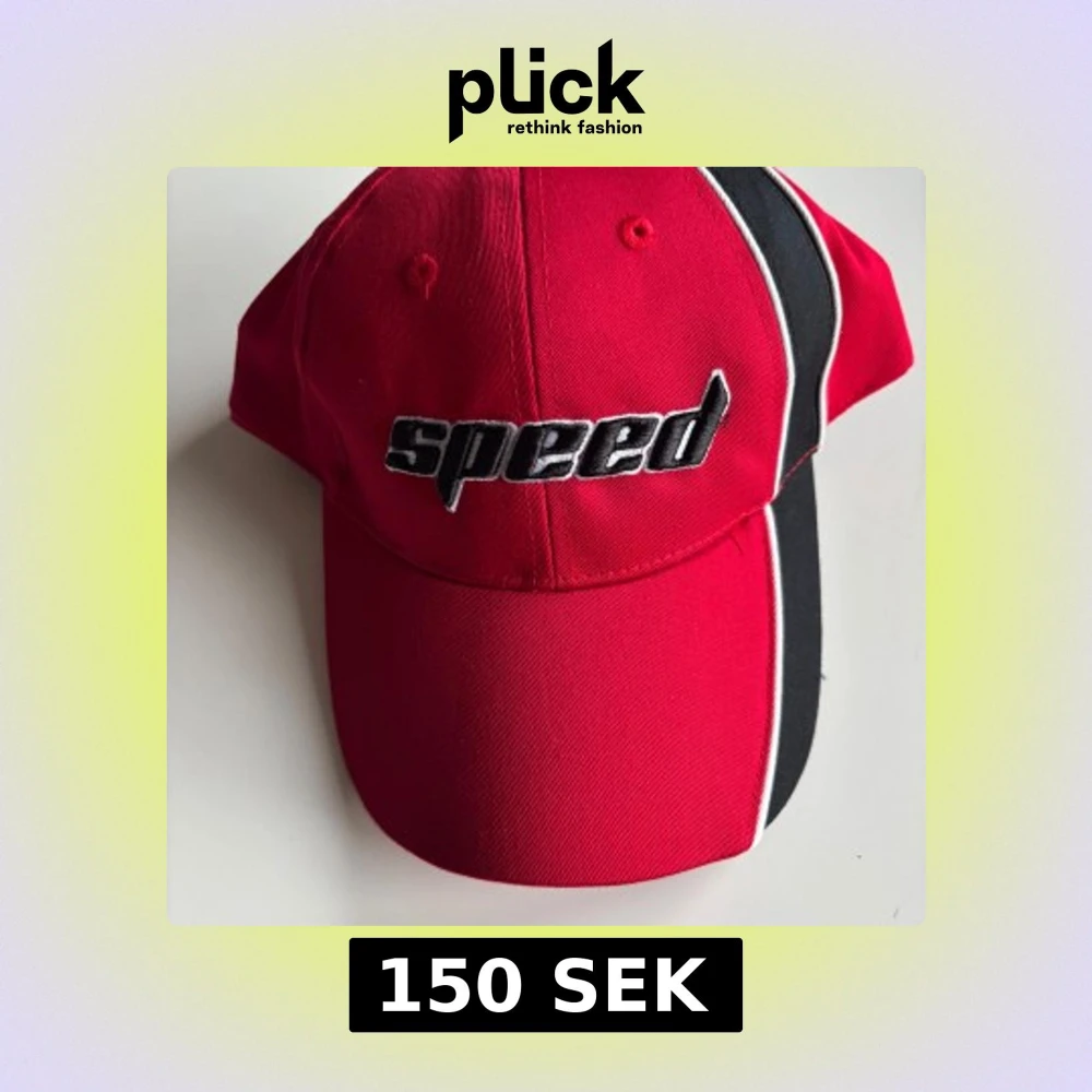 Snygg röd keps med svart och vit detalj på sidan och texten 'speed' broderad framtill. Perfekt för en sportig look.