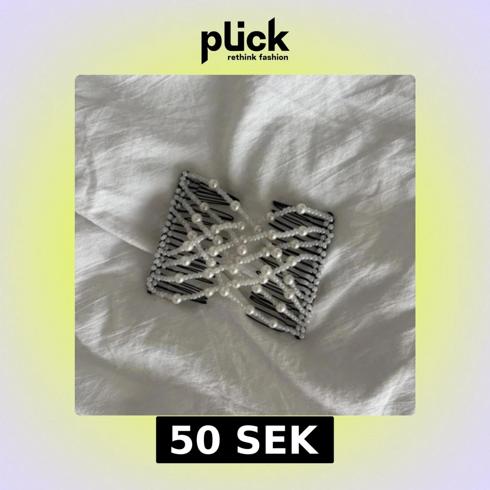 Säljer ett svart diadem med elastiska kammar och dekorativa vita pärlor i olika storlekar. Pärlorna är arrangerade i ett korsat mönster som ger en snygg och unik look. Perfekt accessoar för att lyfta din frisyr.