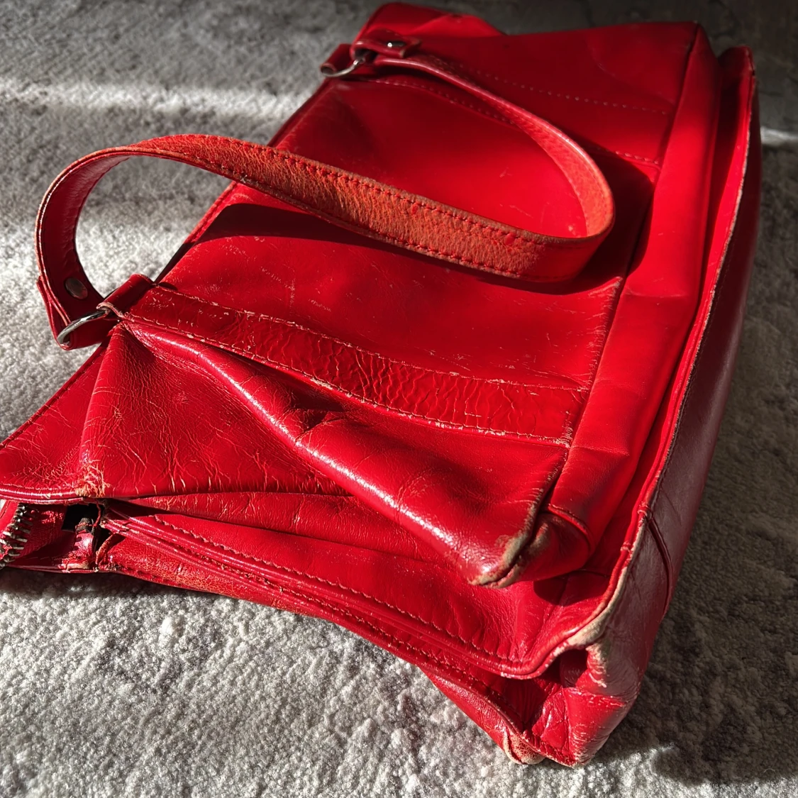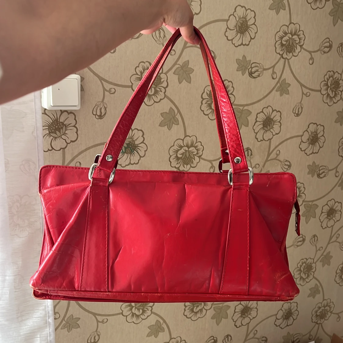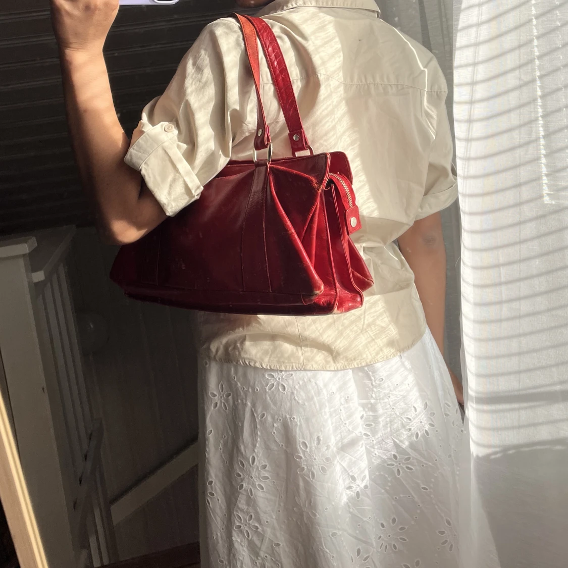 Såå fin röd väska köpt i Köpenhamn för 350DKK (545kr) Bredd 38cm, höjd 17cm, djup ca 9cm. Rymlig! Notera att väskan är i ANVÄND skick men har fortfarande mycket kvar att ge! Handtagen är blekta, lite slitage på undersidan. Insidan nästan felfri.