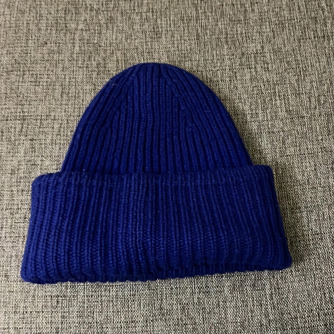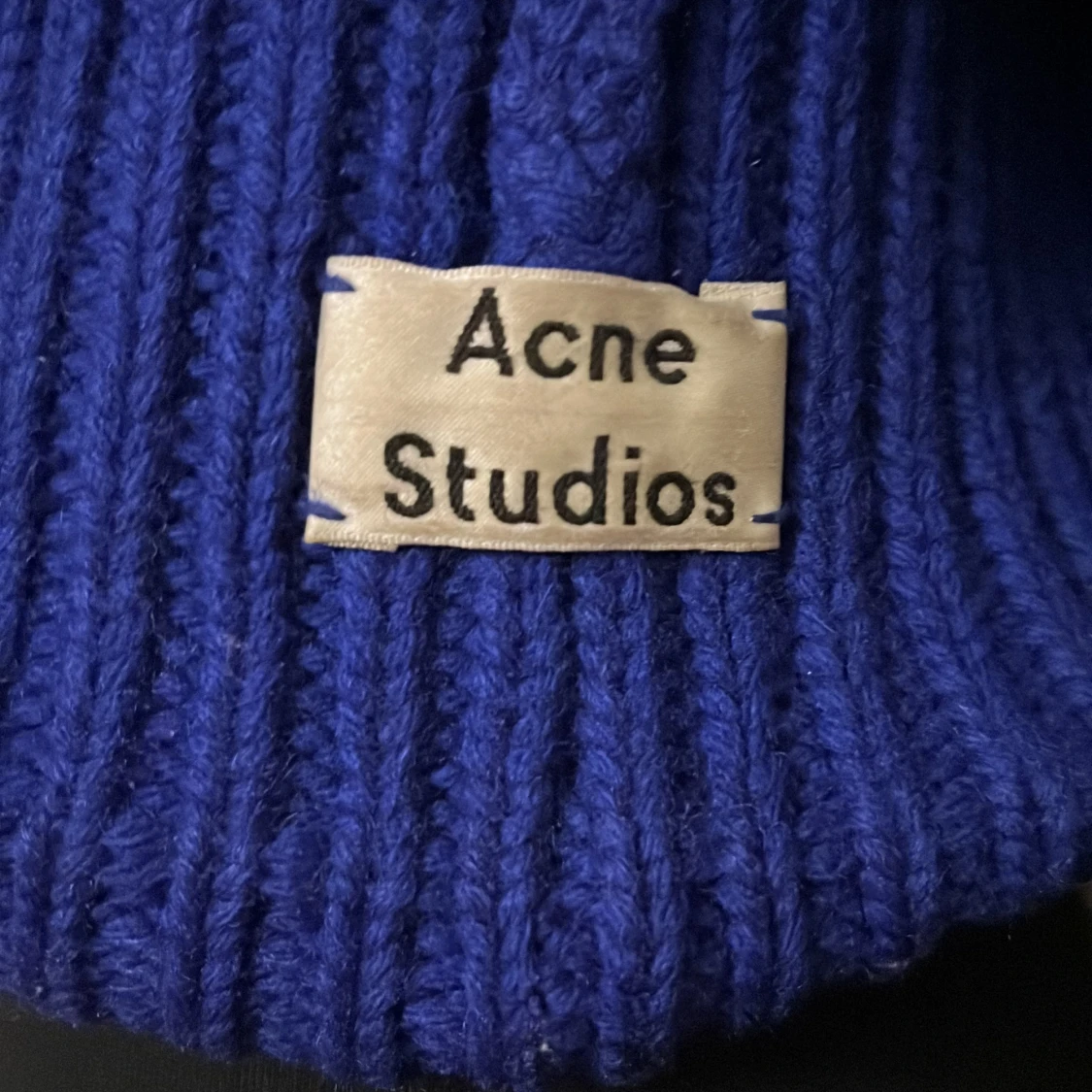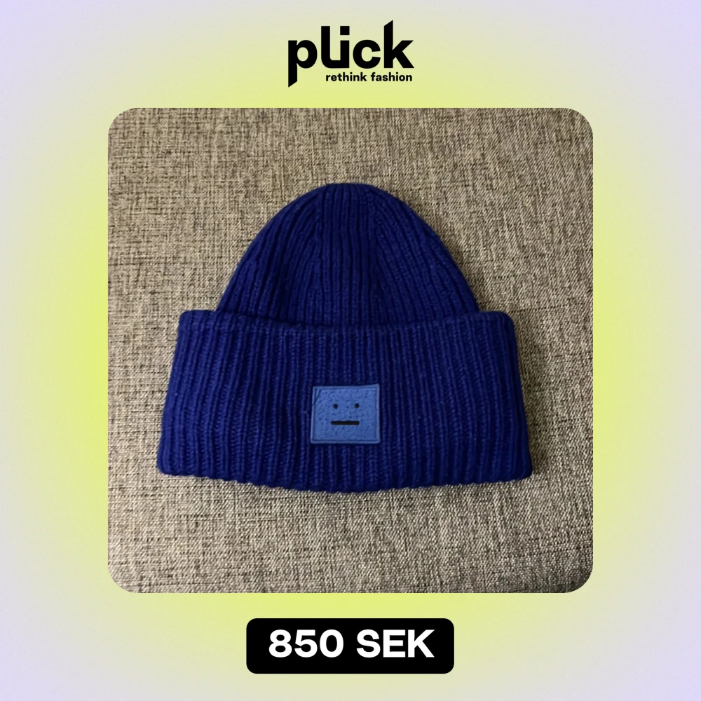 Säljer en snygg blå stickad mössa från Acne Studios. Den har en ribbad design och ett coolt ansiktsmärke framtill. Perfekt för att hålla sig varm och stilren under höst och vinter. Passar de flesta tack vare one size-storleken. 🧢💙
