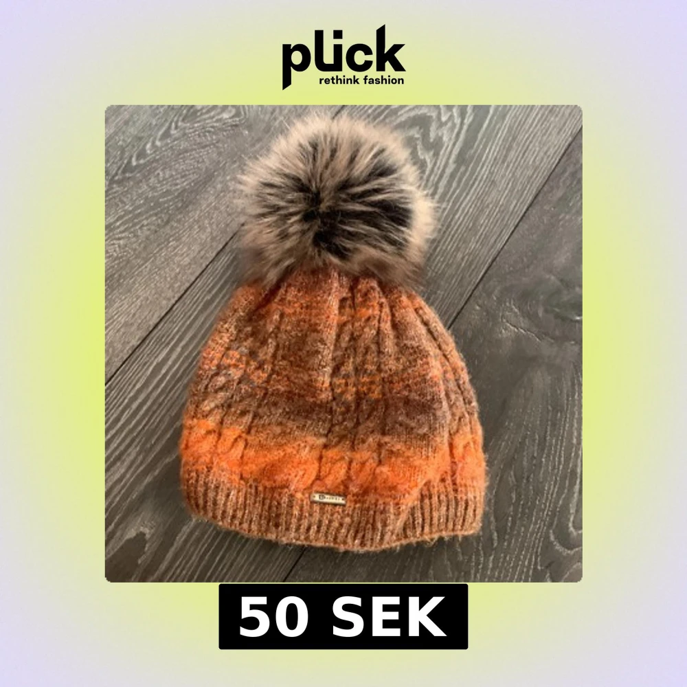 Snygg stickad mössa i orange och bruna nyanser med stor, fluffig pälsboll på toppen. Mössan har ett diskret metallmärke framtill och ett trendigt kabelstickat mönster. Perfekt för att hålla värmen och ge en färgklick till din outfit.