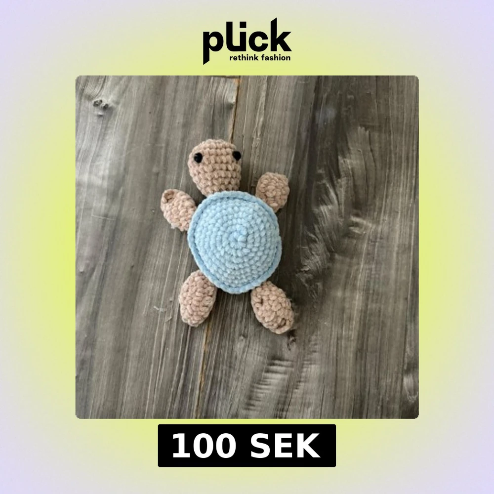En handvirkad mjukissköldpadda i beige och ljusblått garn. Perfekt som present eller dekoration.