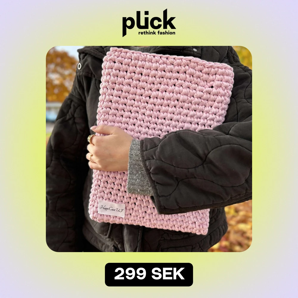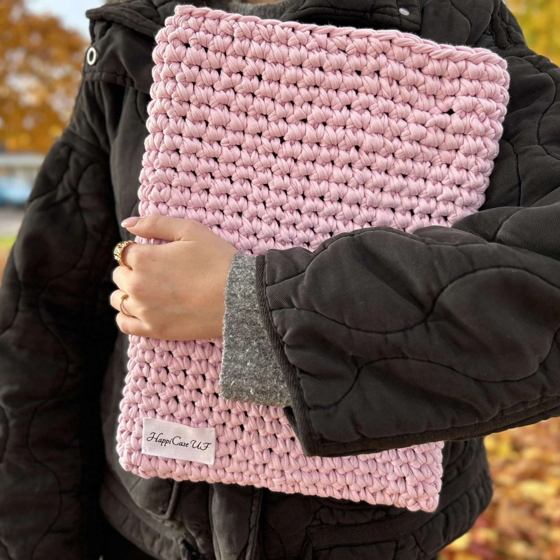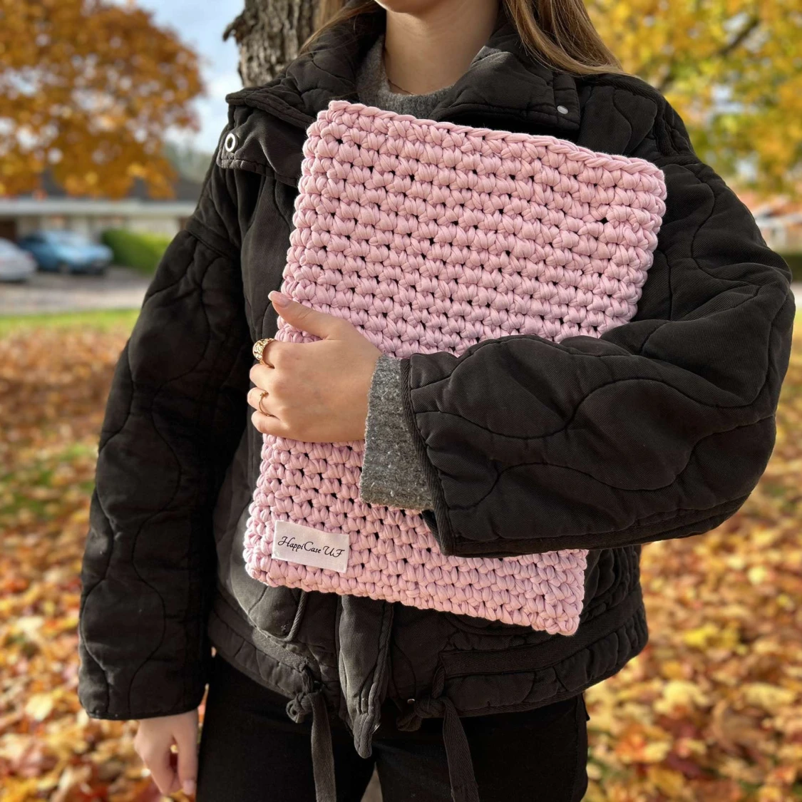 Ett rosa handvirkat datorfodral med måtten 25x33cm som även passar lite mindre bärbara datorer.