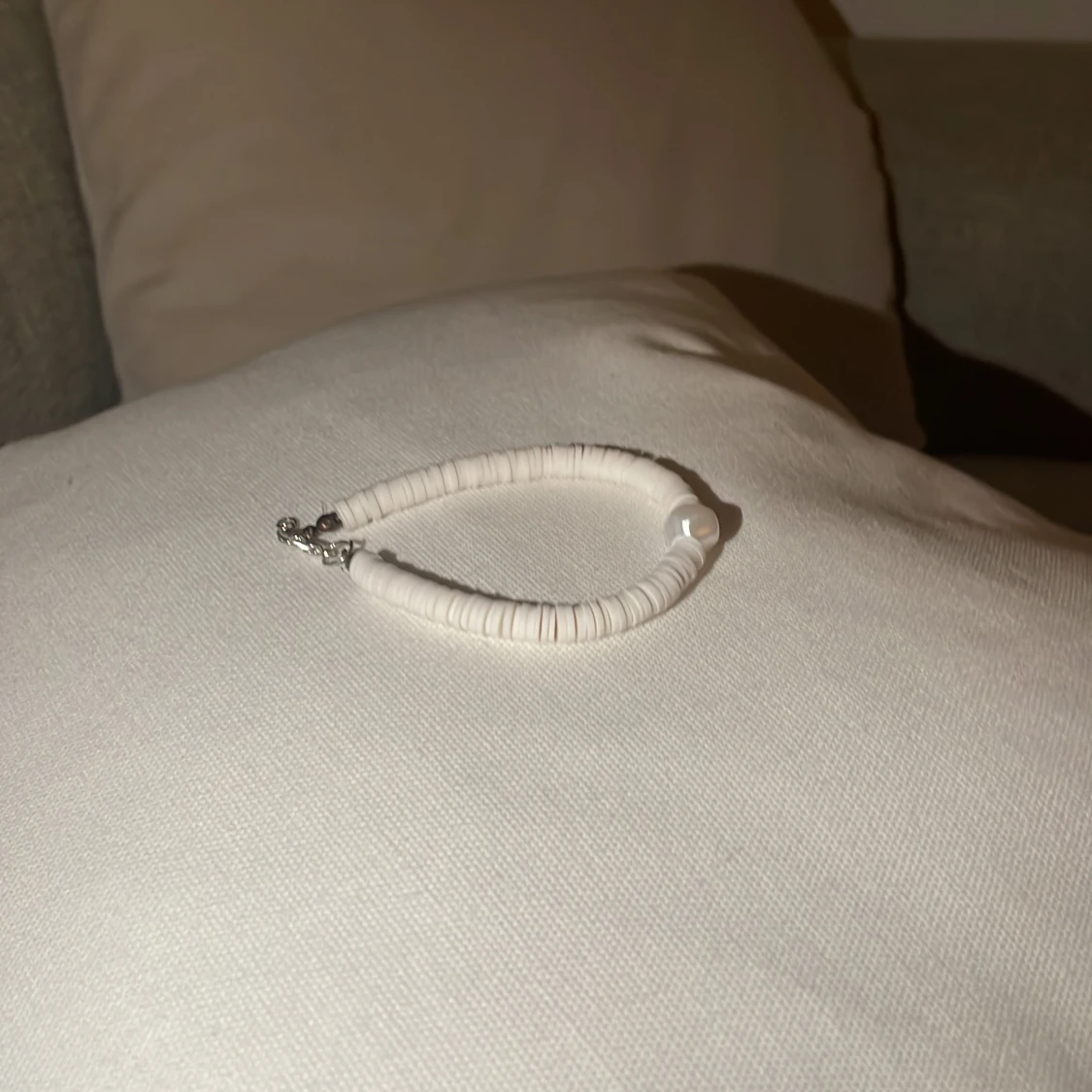 Ett fint vitt armband. Man känner dig väldigt fräsch när men har det. Det är en äkta päla på så priset är höjt🤍⚪️⚪️⚪️