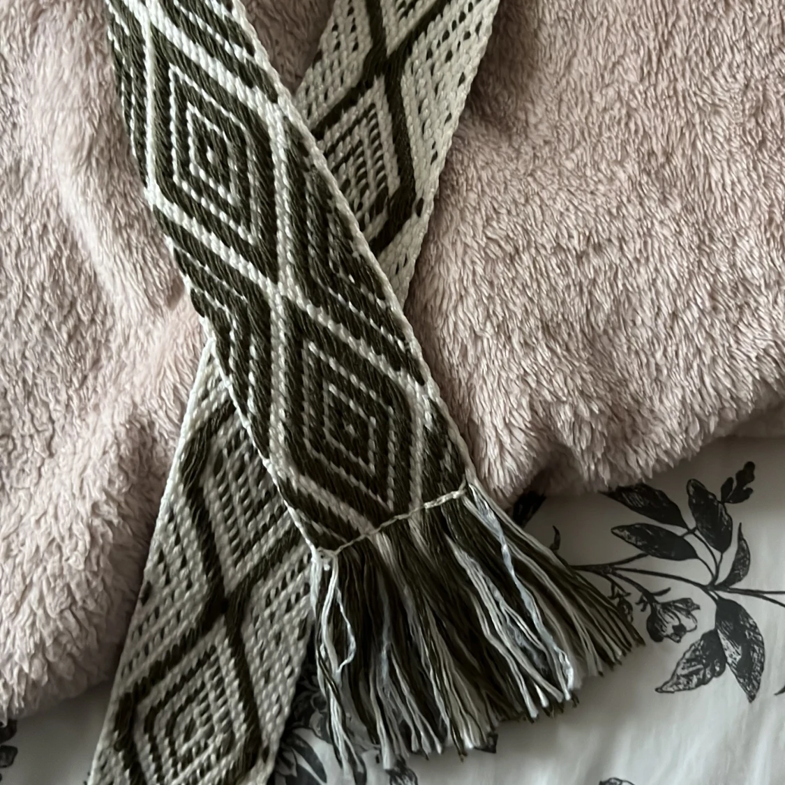 Säljer ett snyggt bälte med ett coolt geometriskt mönster i grönt och vitt. Bältet har fransar i ändarna och är perfekt för att ge en bohemisk touch till din outfit. Det är i bra skick och passar perfekt till jeans eller en klänning. Perfekt för både vardag och fest!