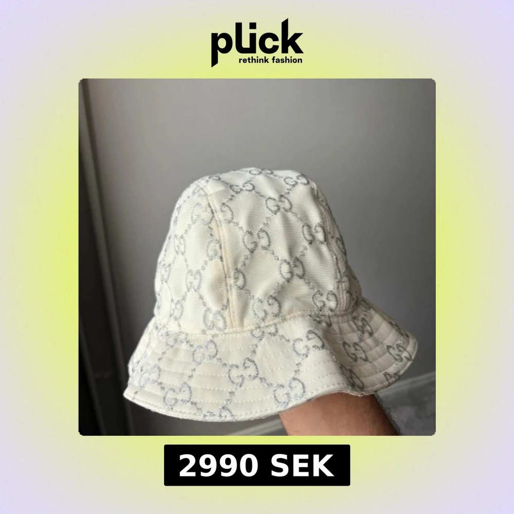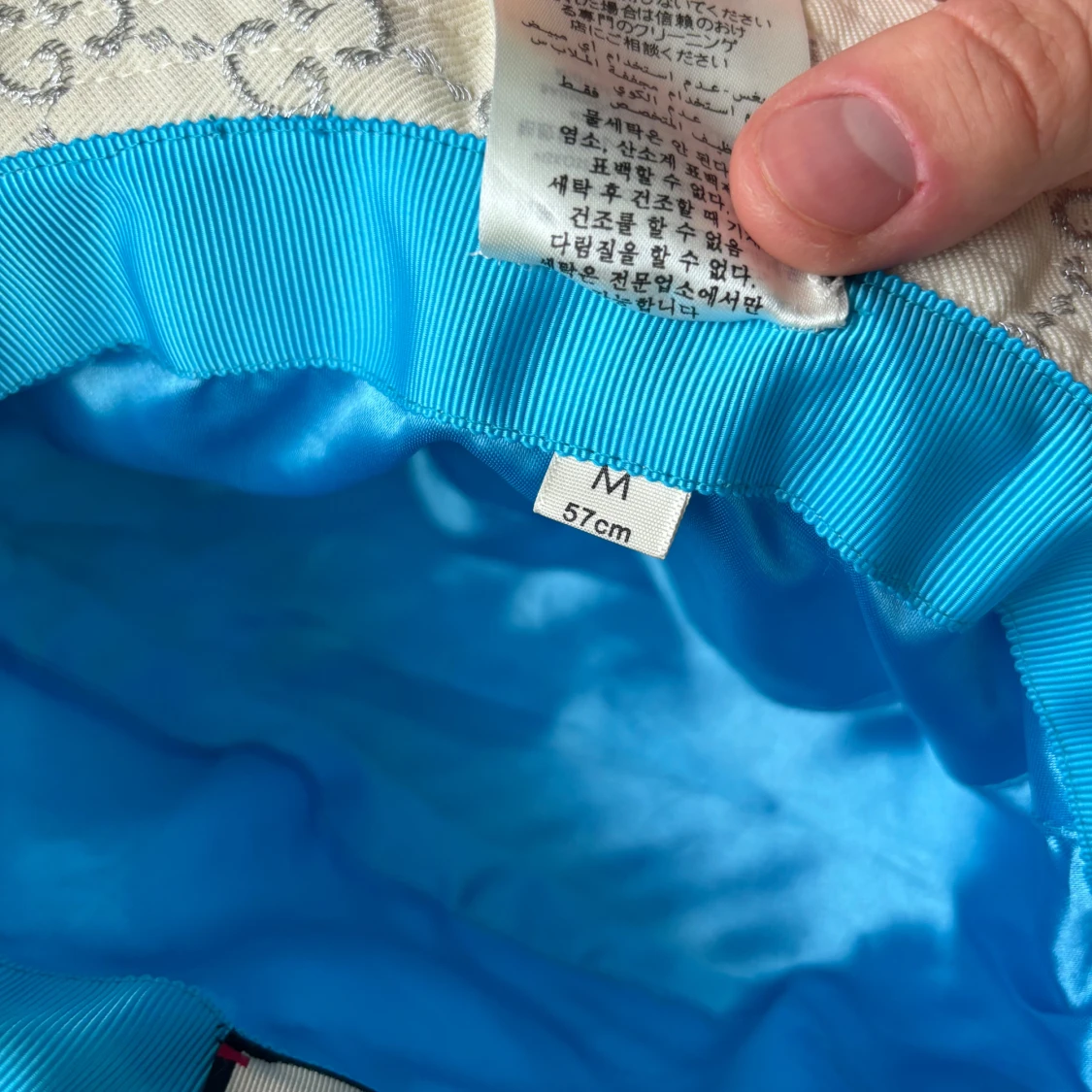 Säljer en snygg vit bucket hat från Gucci med klassiskt GG-mönster i silver. Hatten är tillverkad i bomull och har en blå insida i satin. Perfekt accessoar för att lyfta din outfit med en lyxig touch.