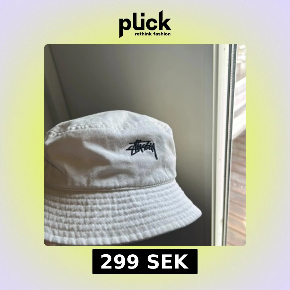 Vit bucket hat från Stüssy med broderad svart logga framtill. Klassisk form med sydda ventilationshål på sidorna. Tillverkad i bomull och passar perfekt för sommaren. Äkta.