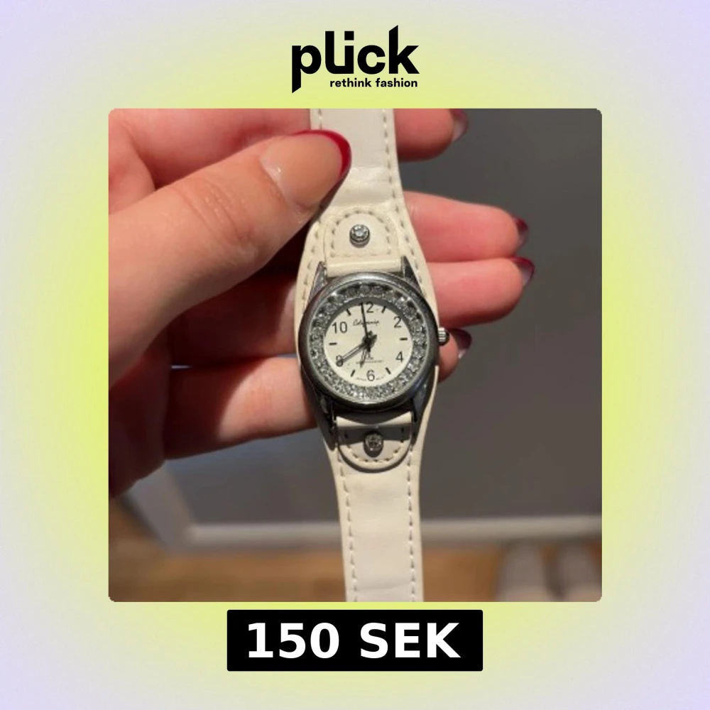 Snygg klocka från Cidarenia med vit läderrem och rund urtavla. Runt boetten sitter glittriga strasstenar som ger extra bling. Urtavlan är vit med svarta siffror och detaljer. Remmen har dekorativa nitar med strass för en cool touch.