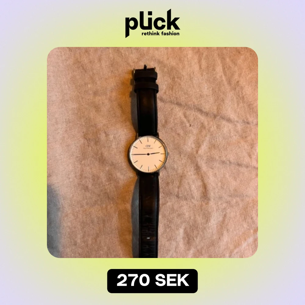 Säljer en stilren och elegant klocka från Daniel Wellington. Den har en vit urtavla med minimalistiska svarta markeringar och en svart läderrem. Perfekt för både vardag och fest!