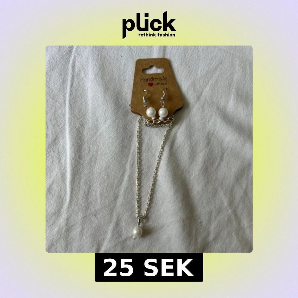 Handgjort smyckesset med ett silverfärgat halsband och matchande örhängen, alla med vita pärlor. Perfekt för att ge en elegant touch till din outfit.💗