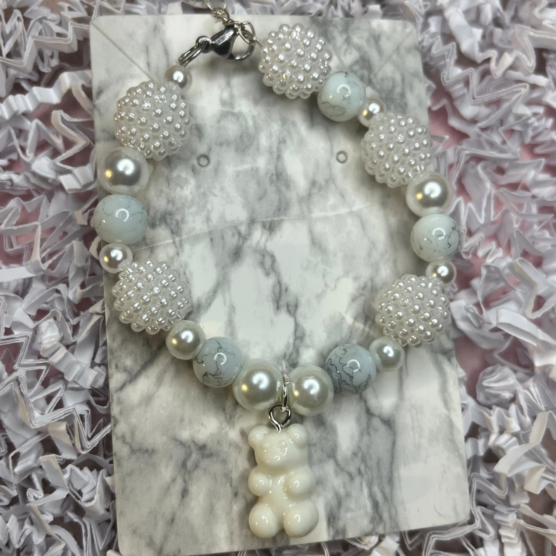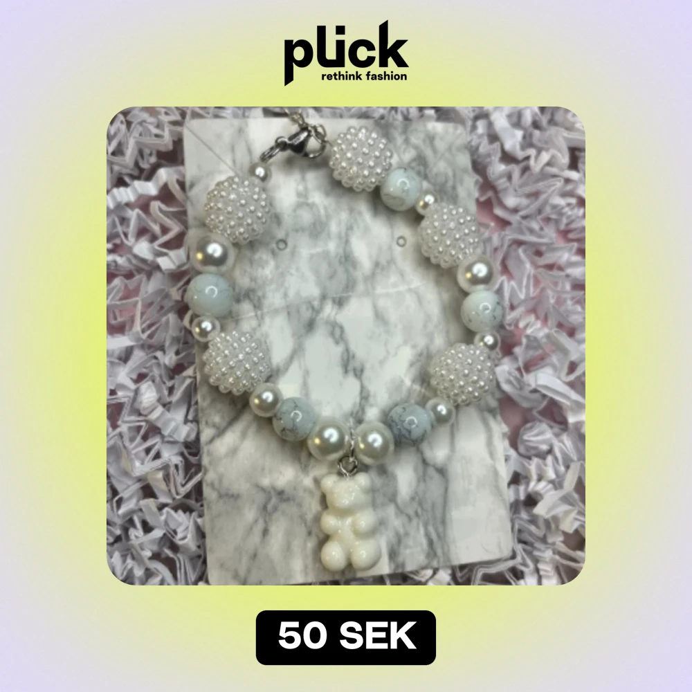Vit armband med silvrig kedja som går att justera, armbandet har även en vit berlock.