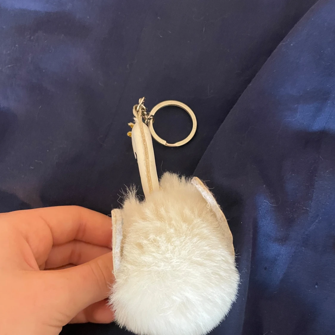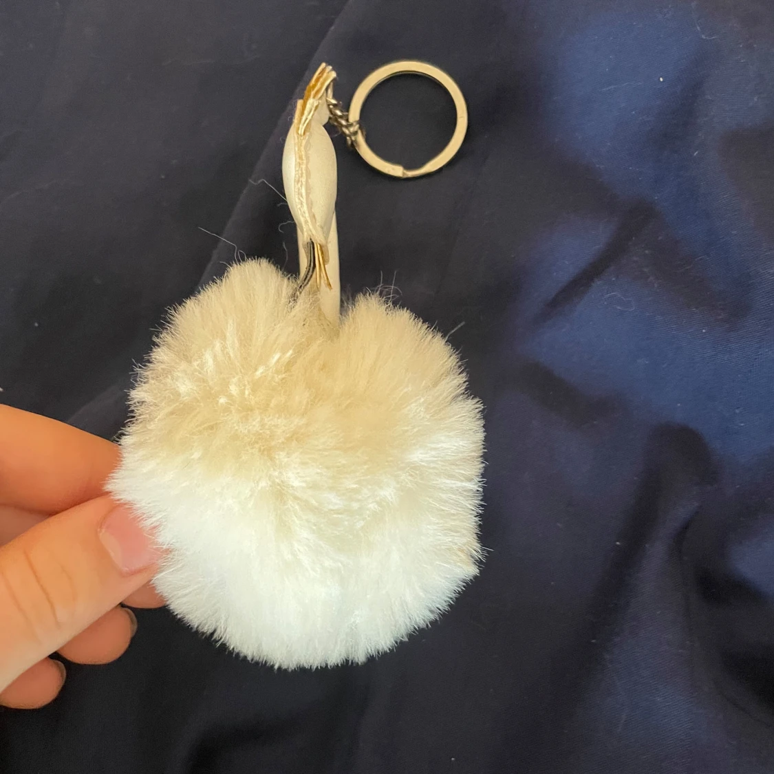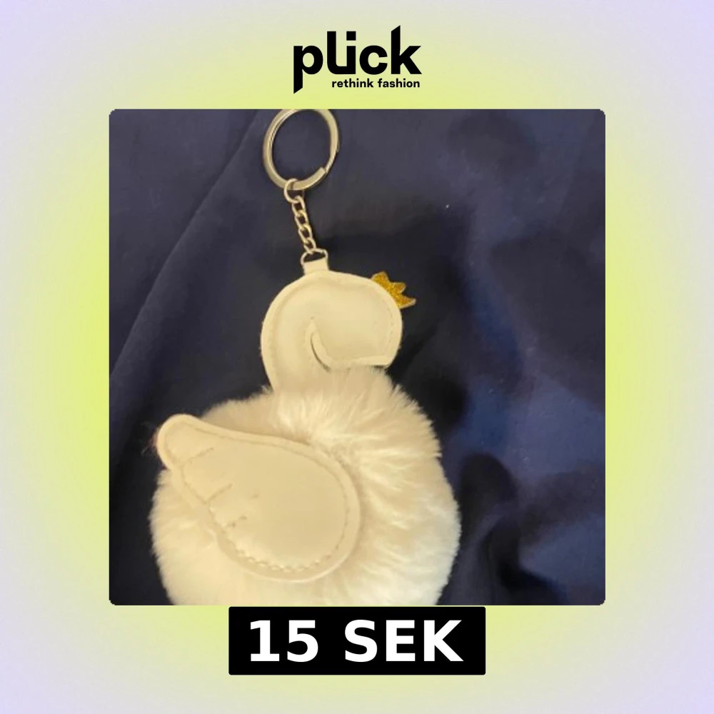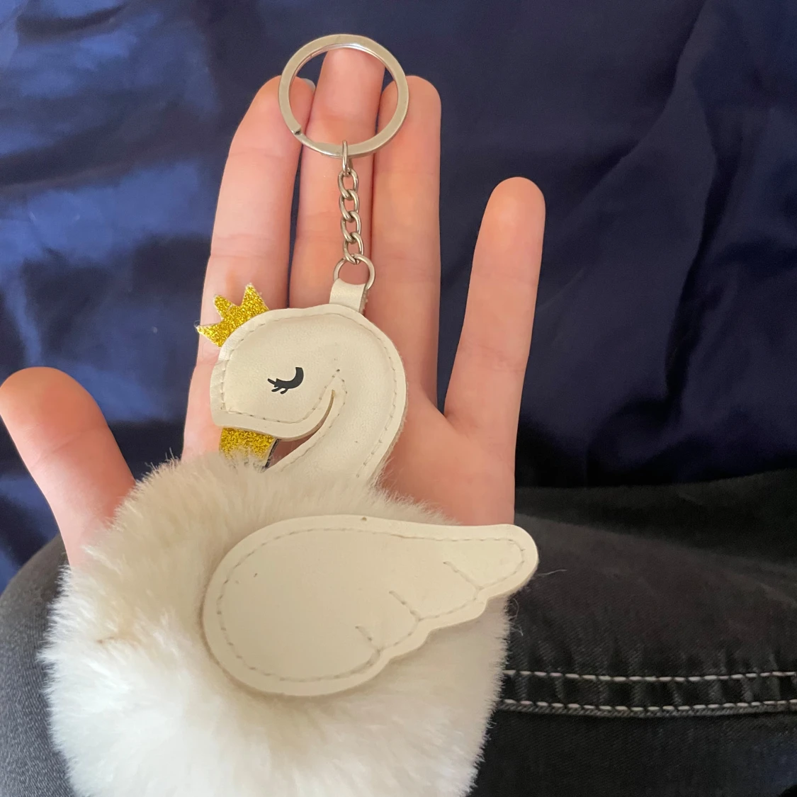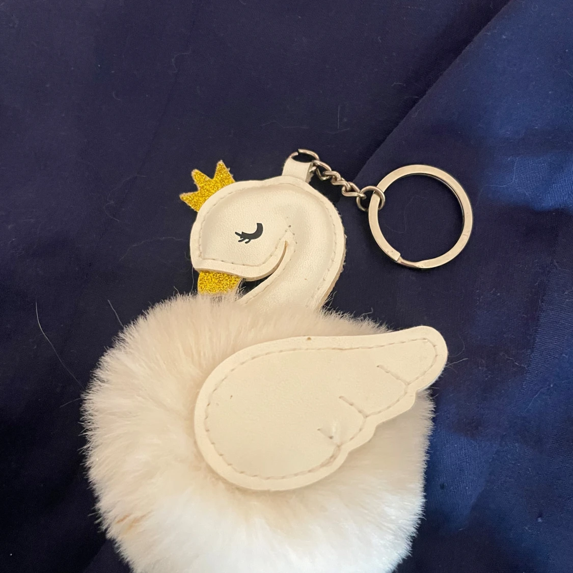 Mjuk nyckelring som är en svan med en liten krona på sig. Det är en storpäls boll som är vit.
