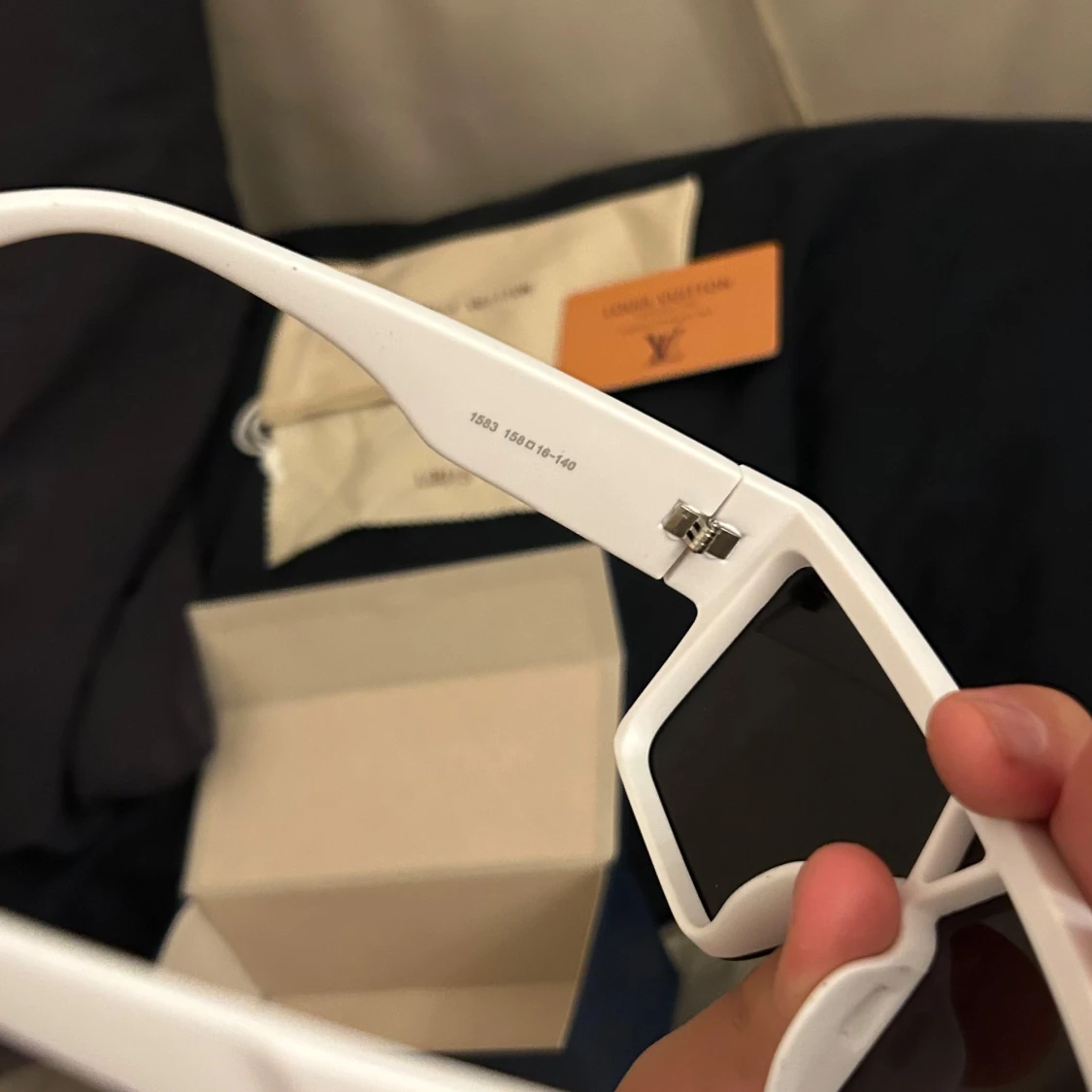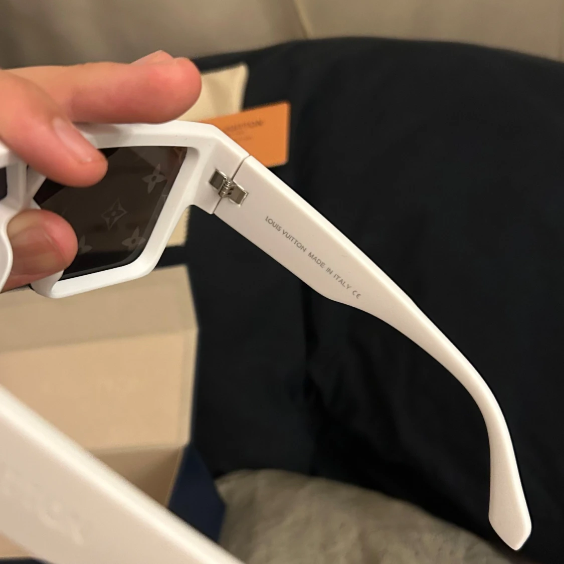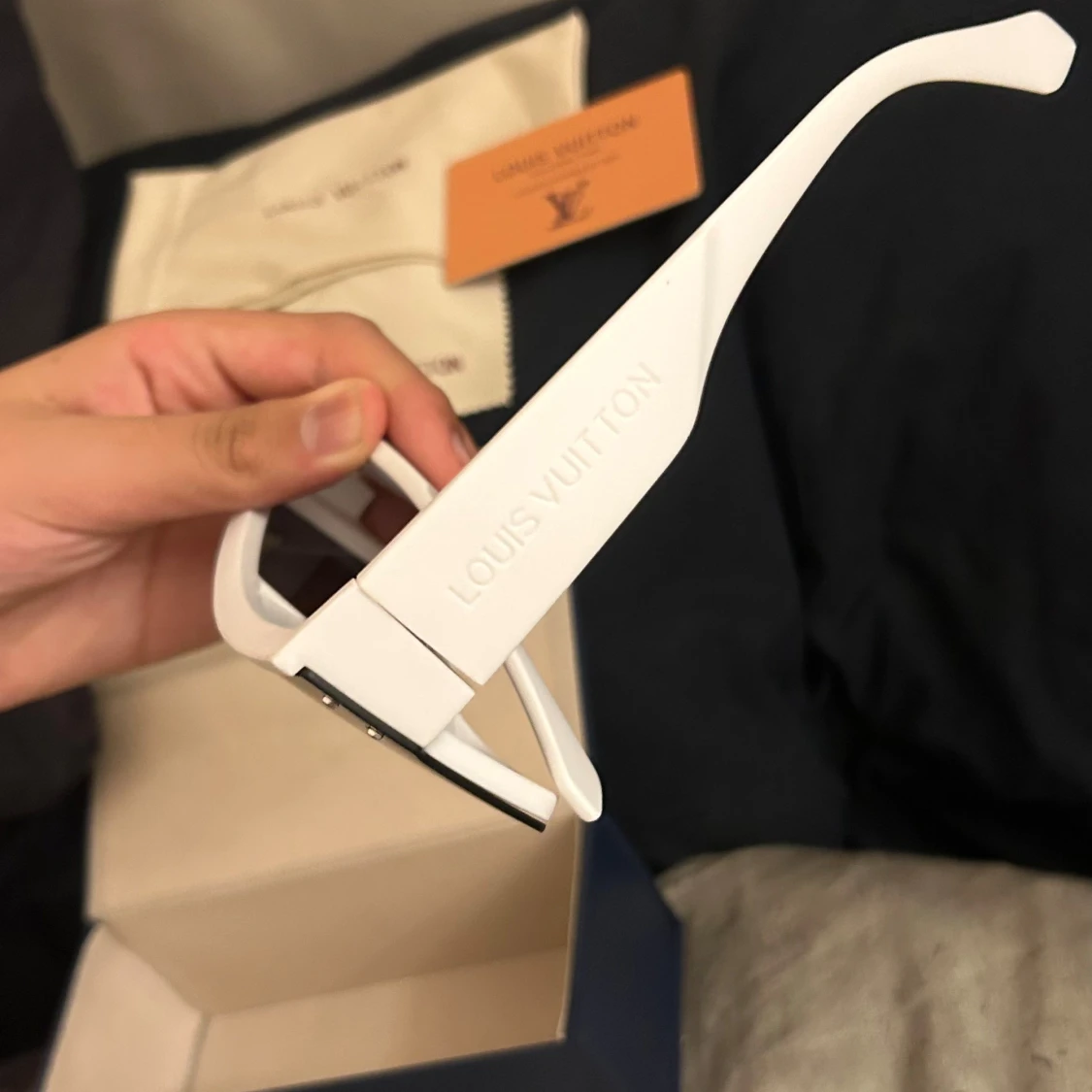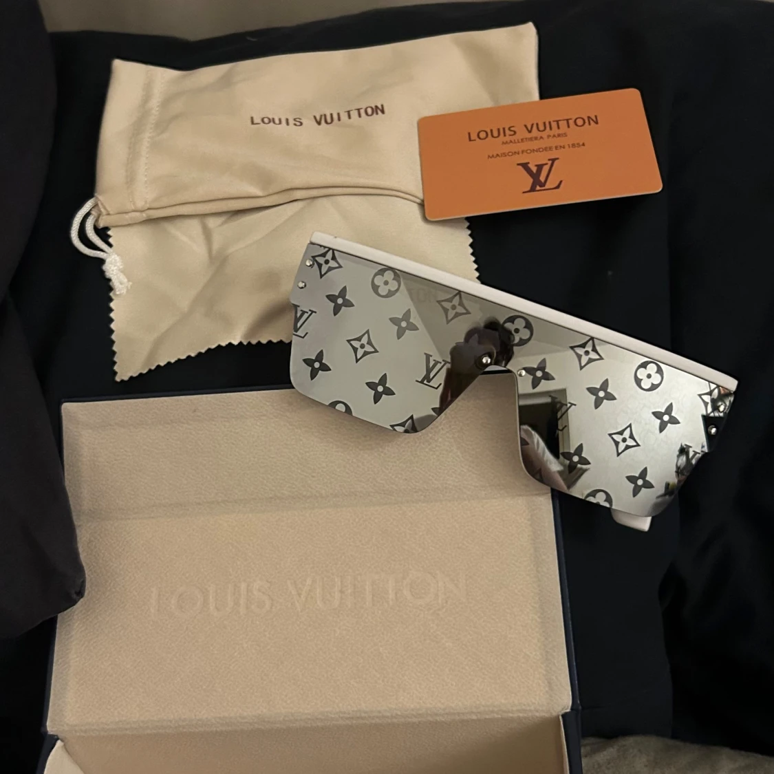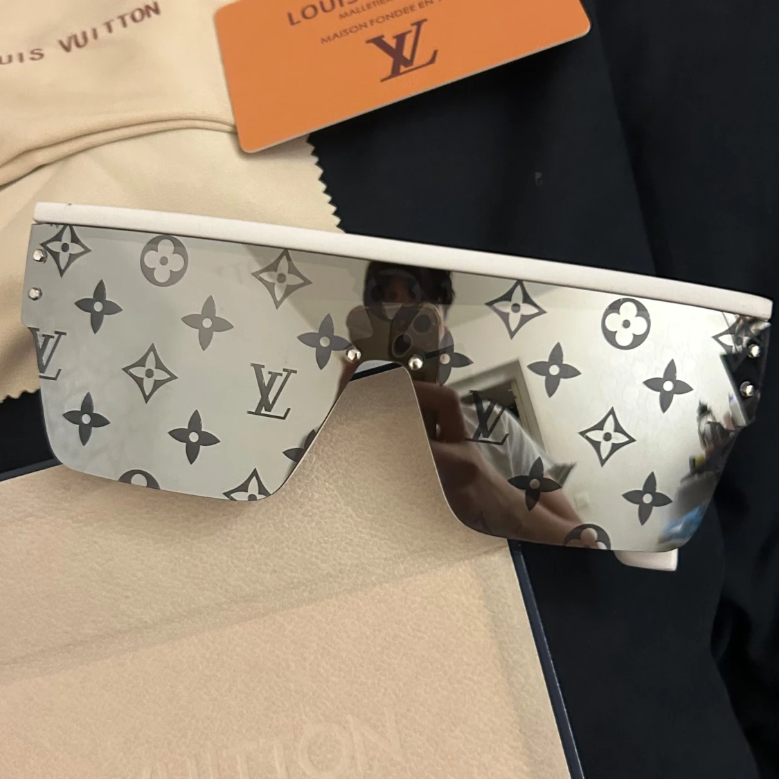 Snygga solglasögon med vita bågar och spegelglas med ikoniskt monogrammönster. Sköldpaddsinspirerad shield-form och breda skalmar med logotyp. Perfekt statement piece för dig som vill sticka ut.