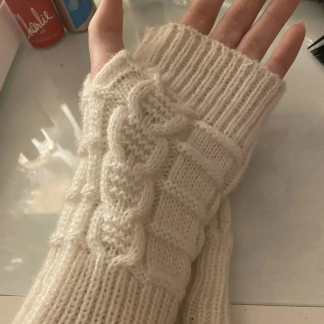 Vita stickade handledsvärmare
