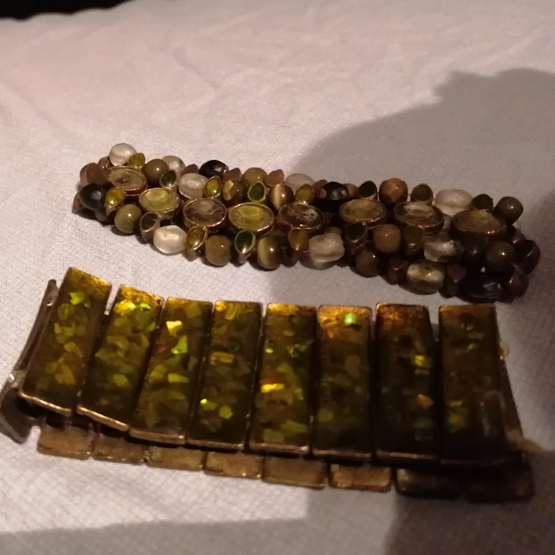 Två stycken gröna armband i lite speciell stil ☘️ aldrig använda och i ganska bra skick det saknas nån diamant på det ena armbandet☘️