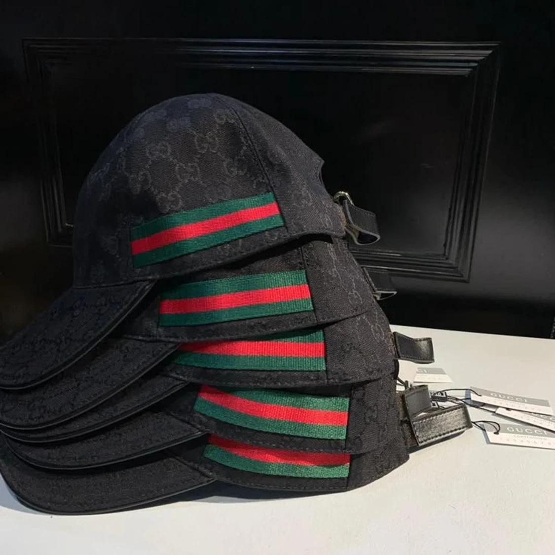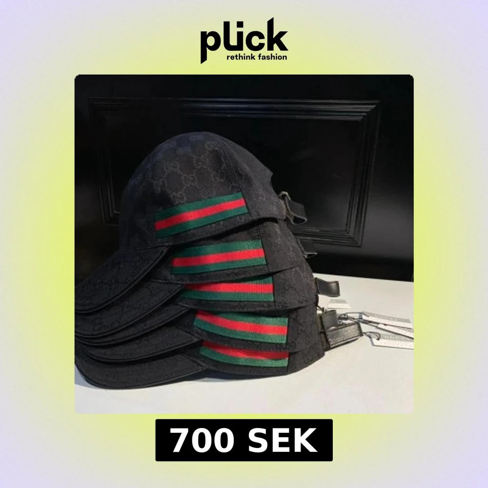 Säljer en svart keps med diskret logomönster i tyget. Kepsen har den klassiska gröna och röda randen på sidan och justerbar rem baktill. Perfekt accessoar för att lyfta din streetwear-look.( 2 stycken kepsar finns till salu)
