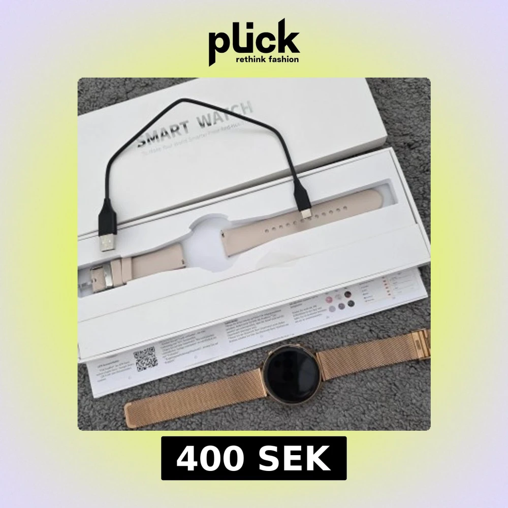 Snygg rund smartklocka i guld med digital display och mesh-armband i metall. Klockan har touchskärm och kommer med extra beige silikonarmband och laddkabel. Perfekt för att hålla koll på steg, sömn och aktivitet direkt på handleden.