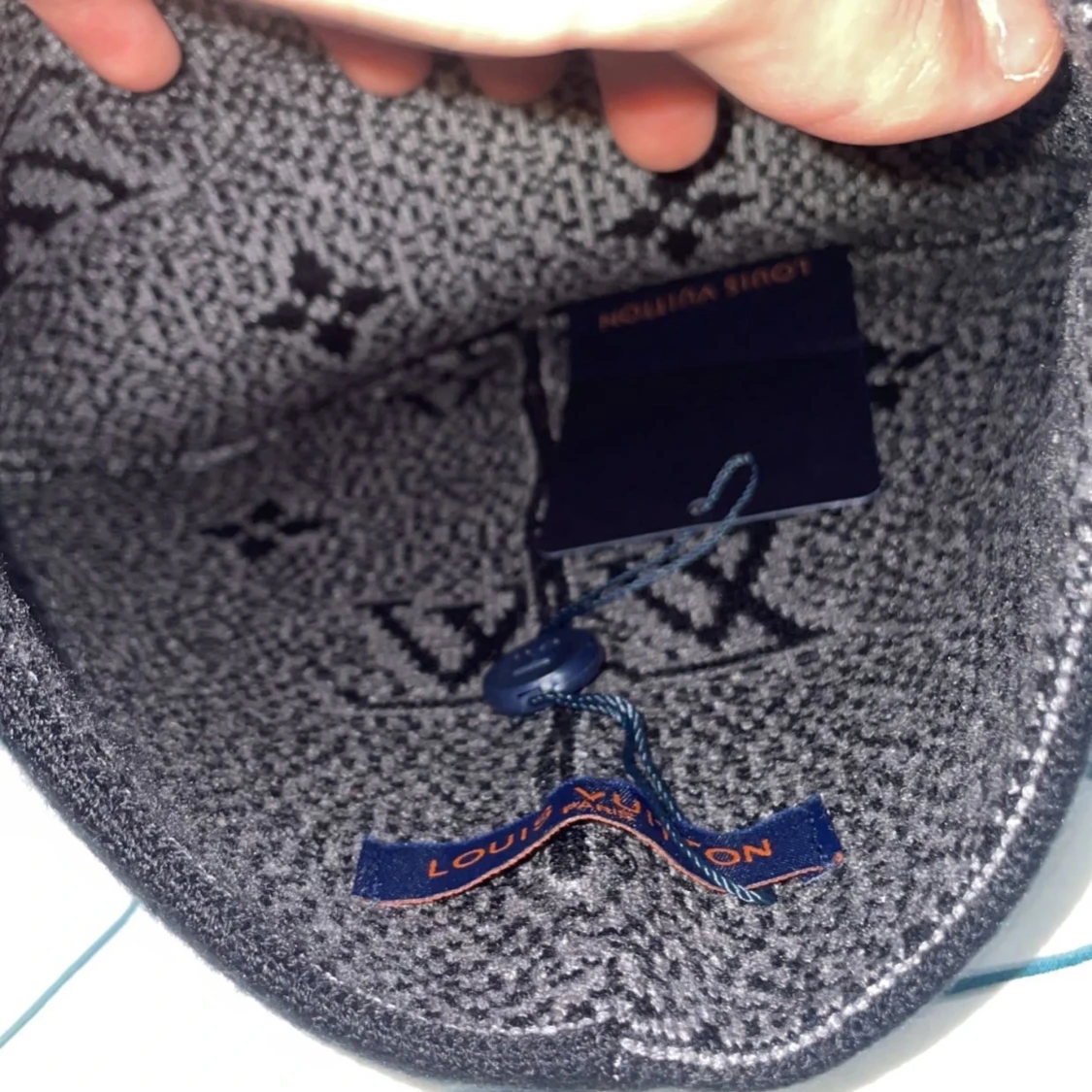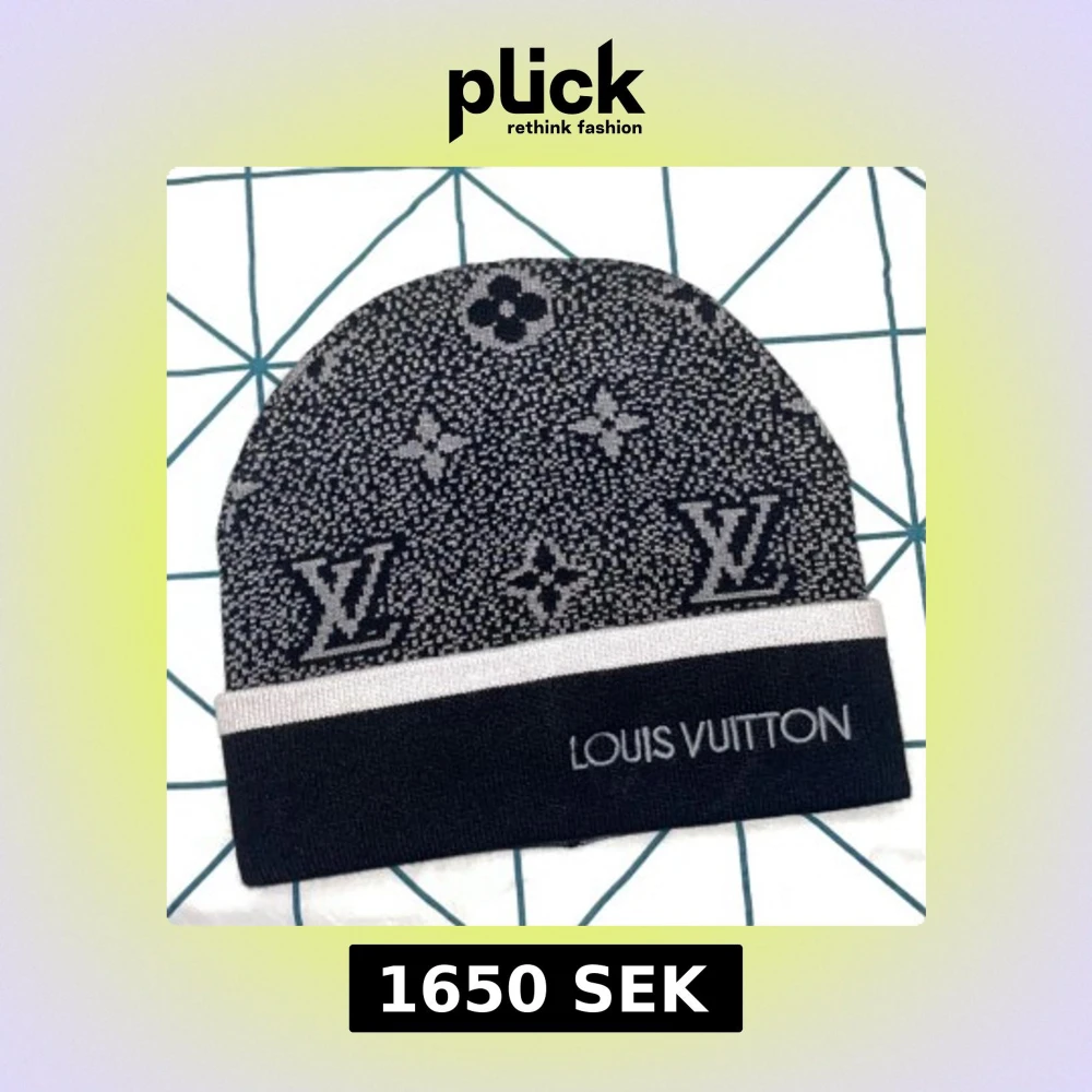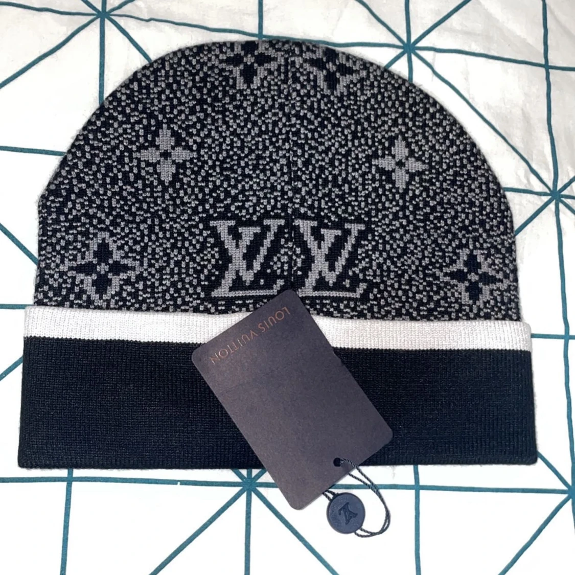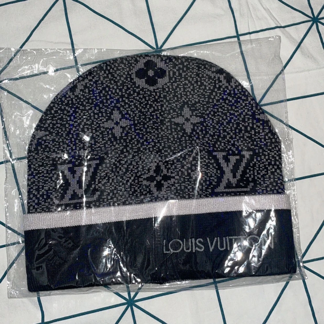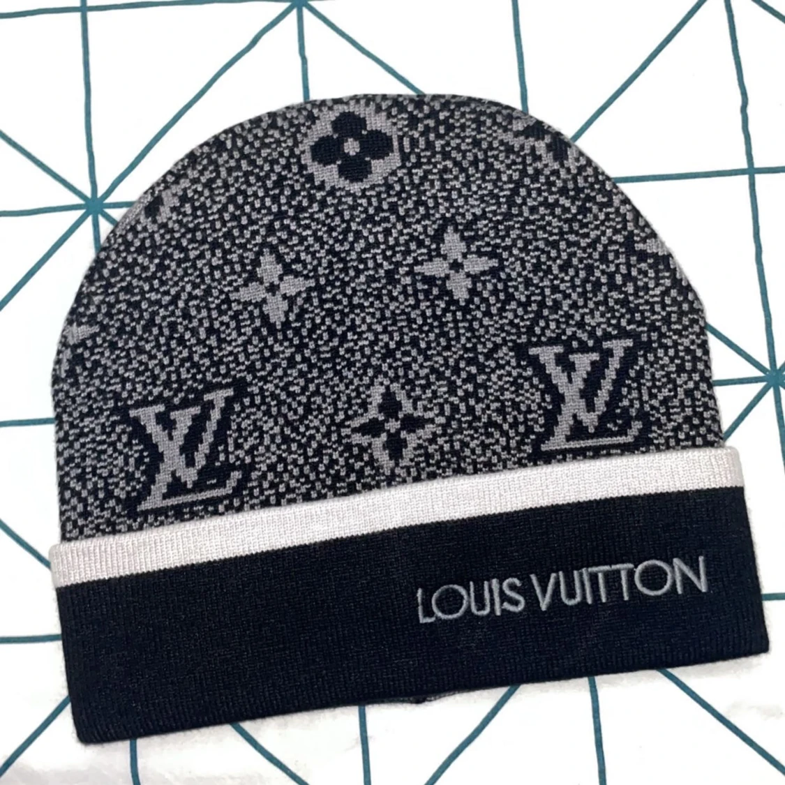 Stilren svart och grå mössa från Louis Vuitton med ikoniskt mönster och broderad logotyp. Perfekt för att hålla värmen med stil.