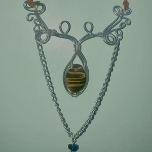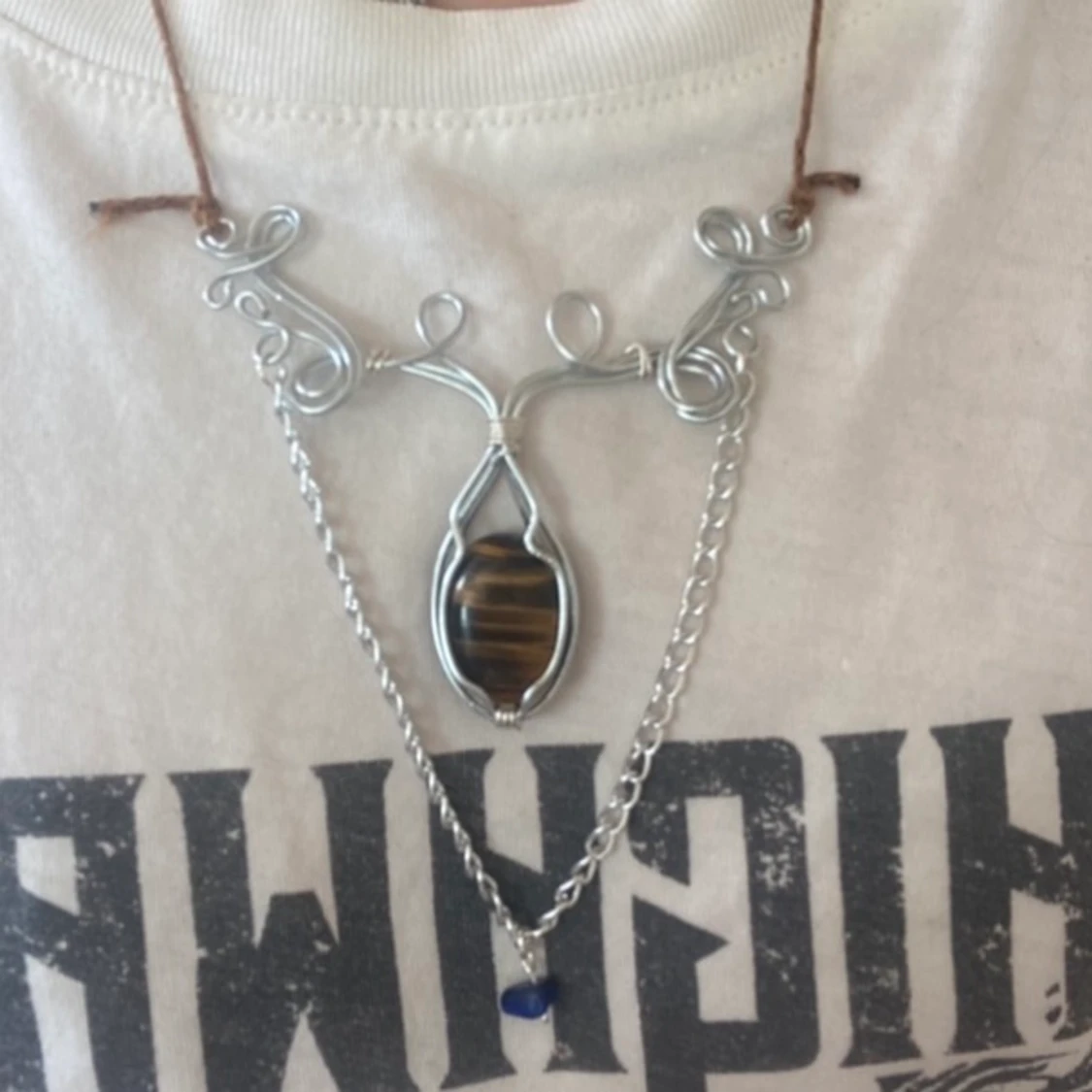 Halsband med tigeröga och lapis lazuli pärla, handgjord med metalltråd
