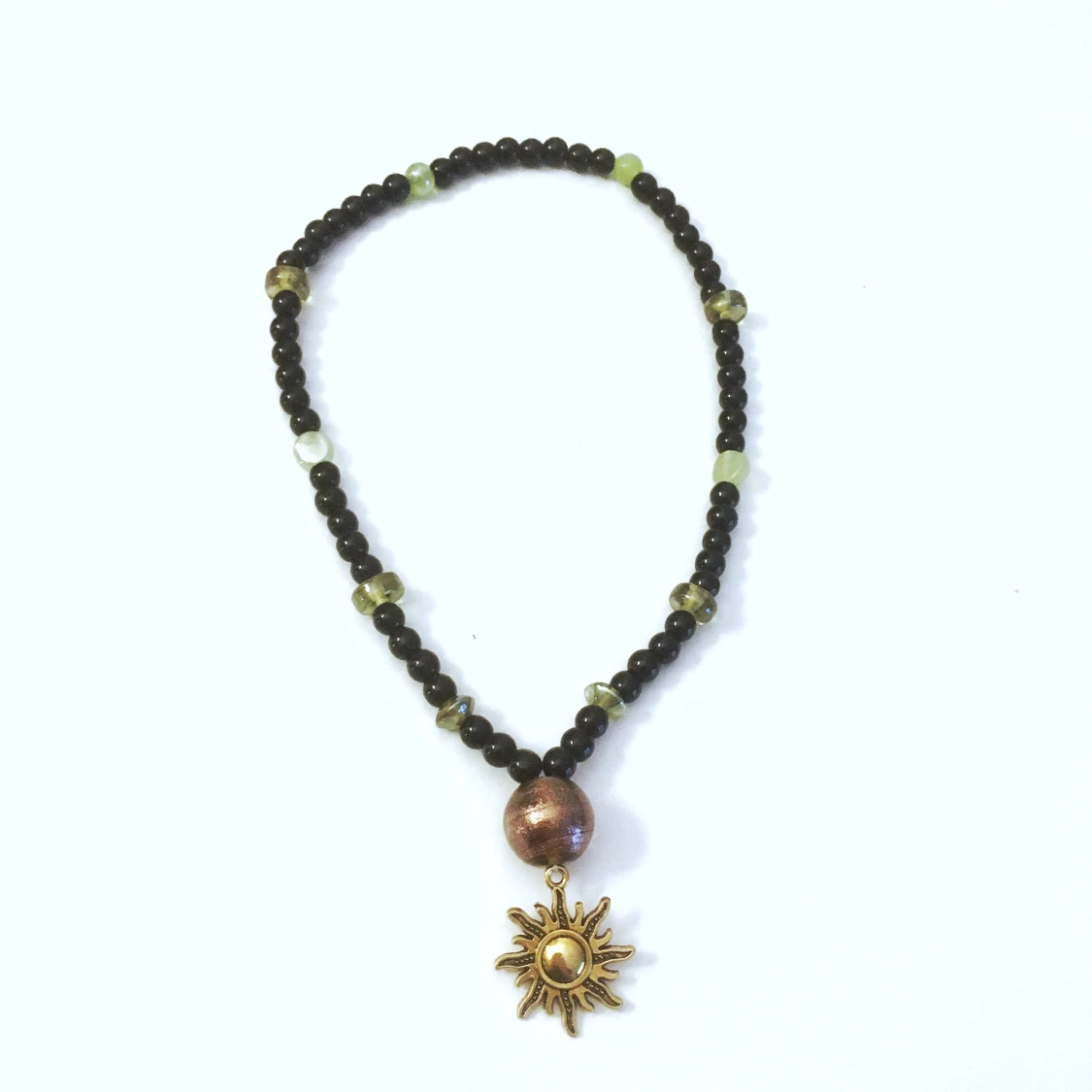 Handgjort (av mig) halsband med pärlor i blandade material samt ett guldaktigt solhänge. Skapat med inspiration av solen och Jupiter. Visste du att Jupiters kärna är varmare än solens yta? 🌞 Halsbandet är elastiskt och dras lätt över huvudet.