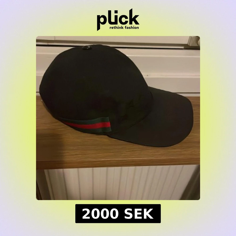 Snygg svart keps med gröna och röda ränder på sidan. Perfekt för en stilren look. Gucci kan diskuteras
