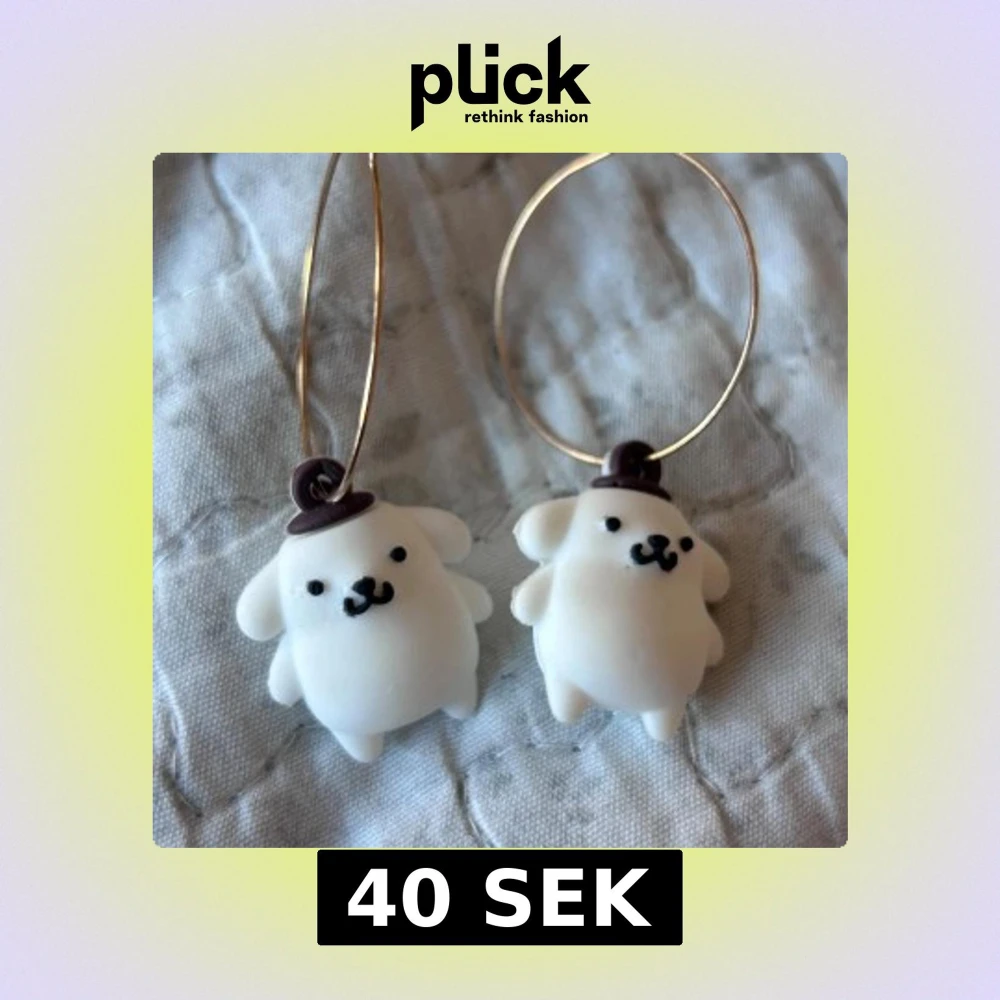 Supergulliga örhängen med vita hundar i 3D-design och små bruna hattar. Hängena sitter på tunna guldfärgade ringar. Perfekta för dig som gillar unika och lekfulla accessoarer med en söt twist.