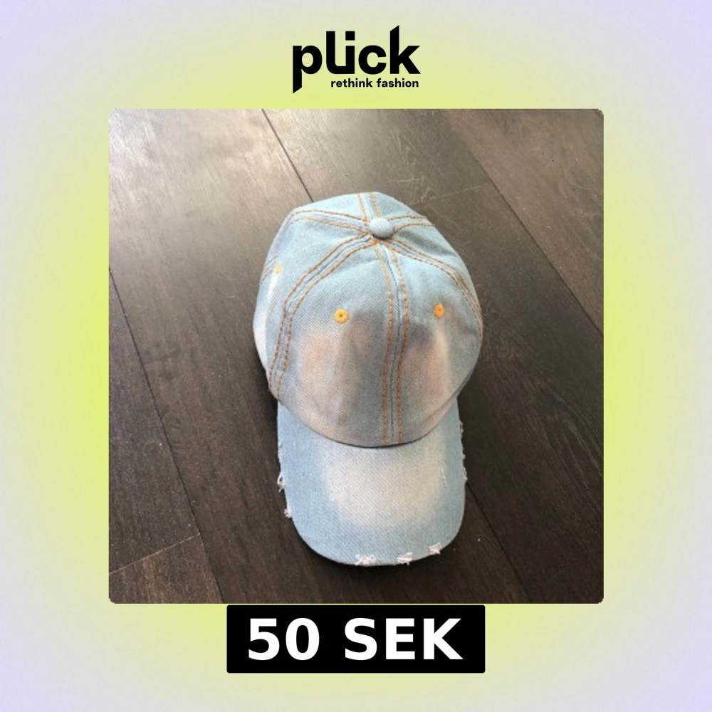 Snygg ljusblå keps i jeansmaterial med slitna detaljer och orange sömmar. Kepsen har en justerbar rem baktill. Aldrig använd 😋