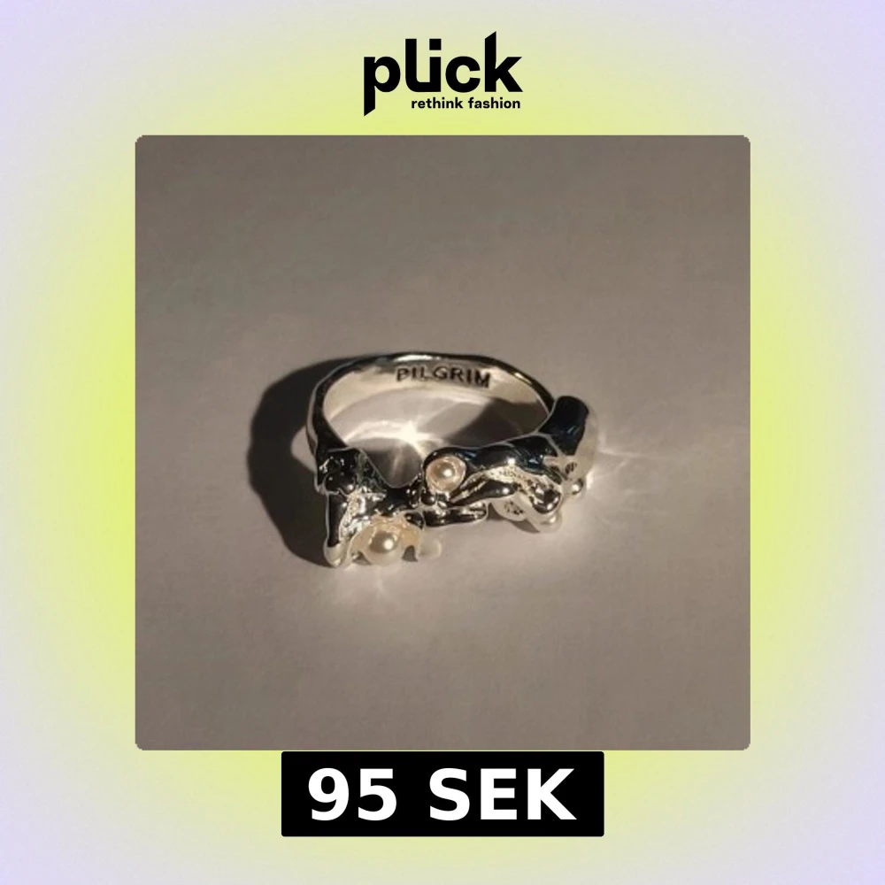 Nästan aldrig använt, Org pris 449🤍 ADJUSTABLE. Unik och chunky silverring från Pilgrim med organiska former och små vita pärlor. Ringen har en modern, konstnärlig design som sticker ut och passar perfekt för dig som gillar statement-smycken.