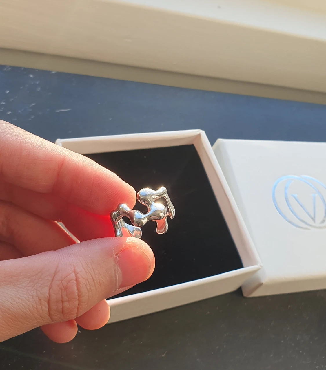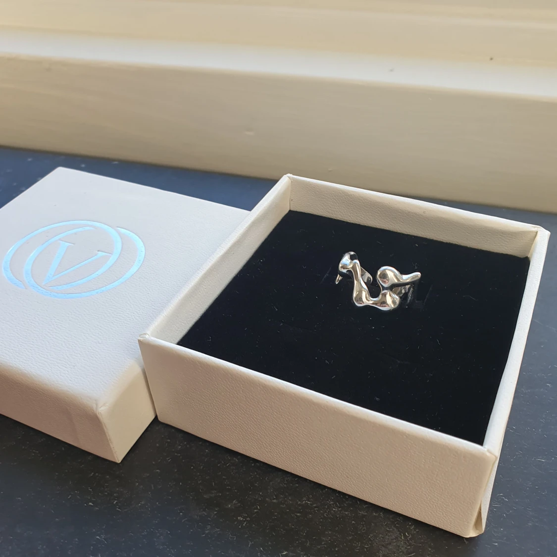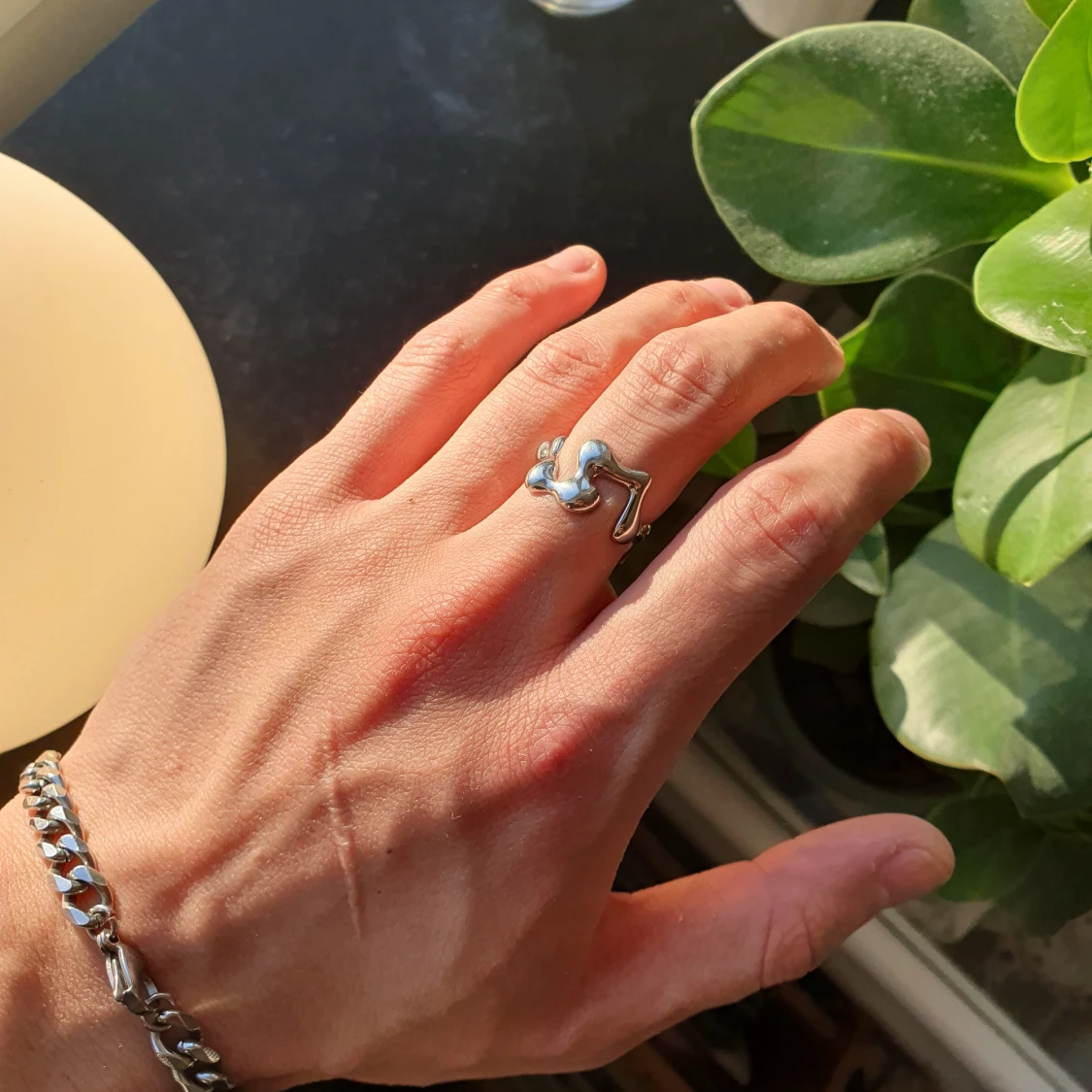 En ring från Videri i stilen "liquid metal jewelry". Storlek 7 men ringen är böjbar så kan anpassas. Gjord av stainless steel med silver coating Se www.videri.store/shop/ERIN för storleksguide