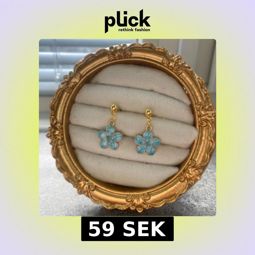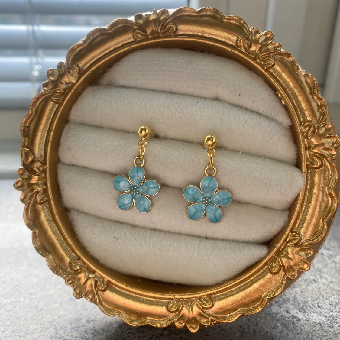 Handgjorda Charmiga örhängen med blå blommor och guldfärgade detaljer. Perfekta för att ge en färgklick till din outfit. Blommorna har en fin detalj i mitten som ger extra elegans.