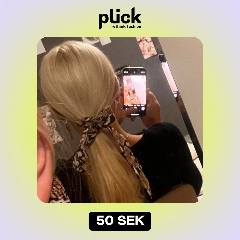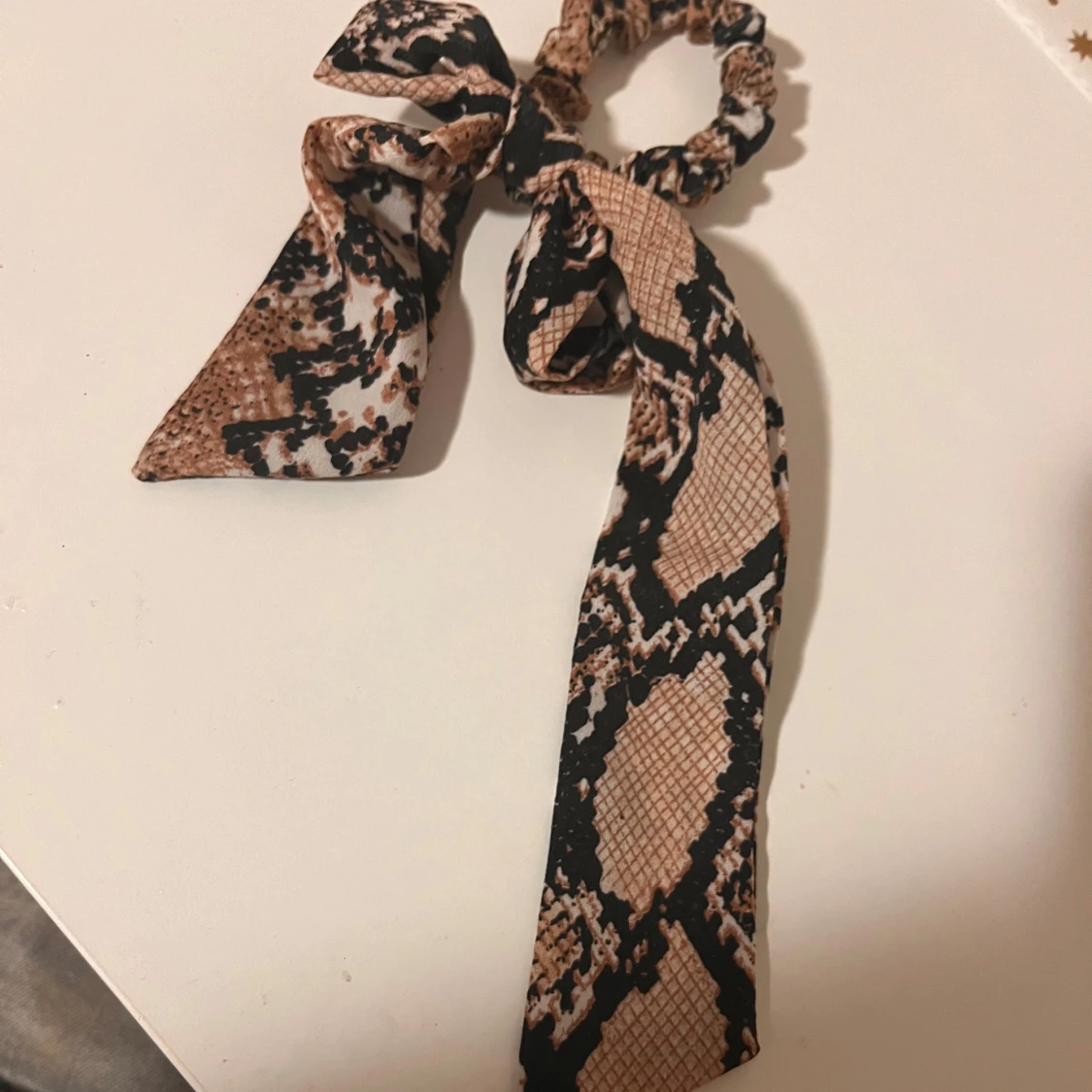 Säljer en superfin hårsnodd med ormmönster i beige och svart. Den har en snygg rosett som ger en extra touch till din frisyr. Perfekt för att piffa upp en enkel hästsvans eller fläta. Passar både till vardags och fest!