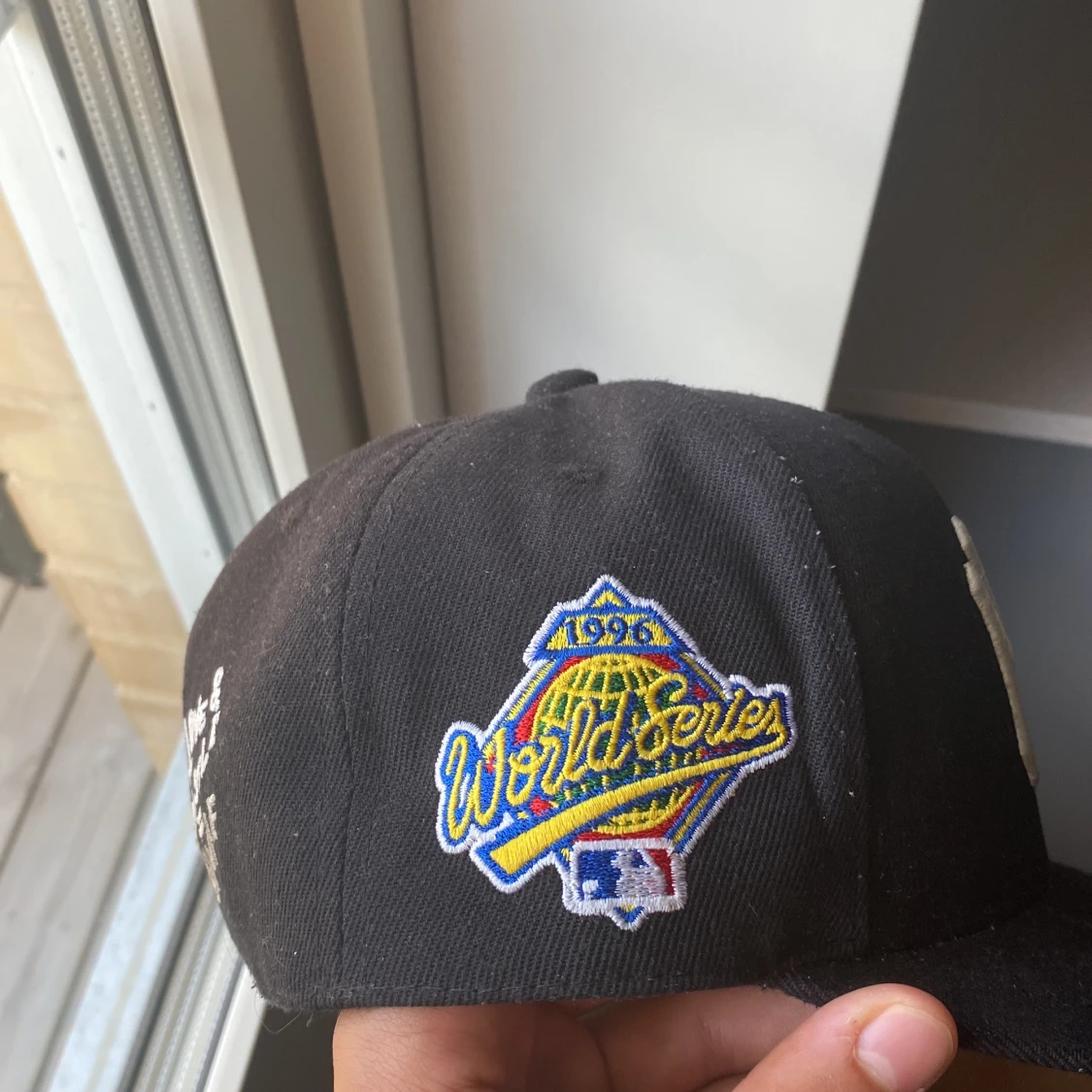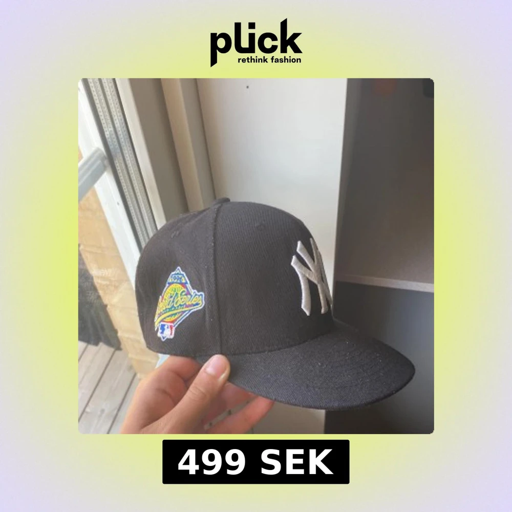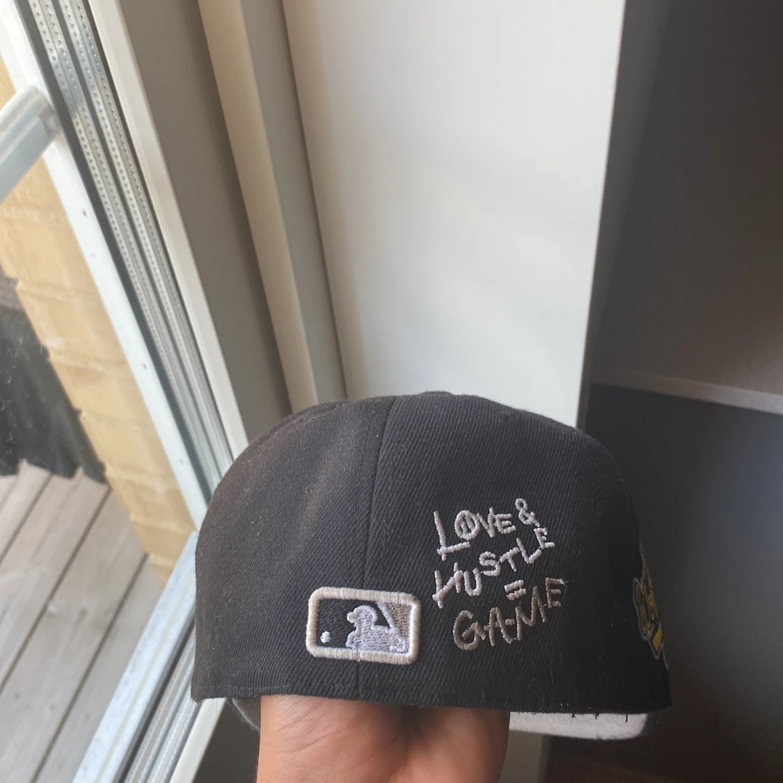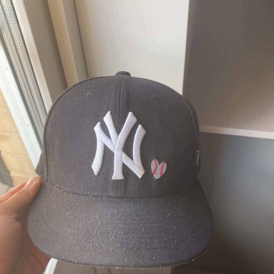 Säljer en New York Yankees keps med vit broderad NY-logga framtill och ett litet hjärta i form av en baseboll. Sidan har färgglatt 1996 World Series-märke och baksidan har texten 'Love & Hustle = Game' broderat. Klassisk rak skärm och cool streetstil.