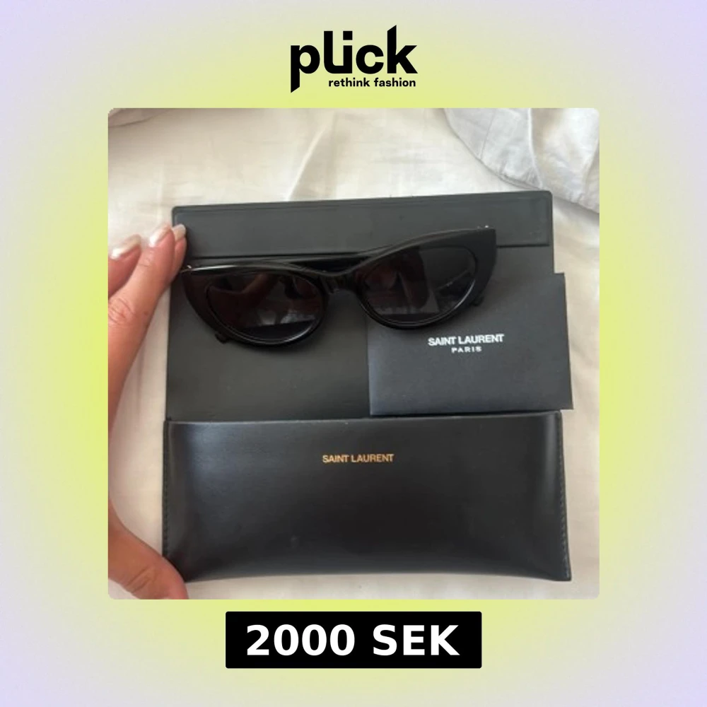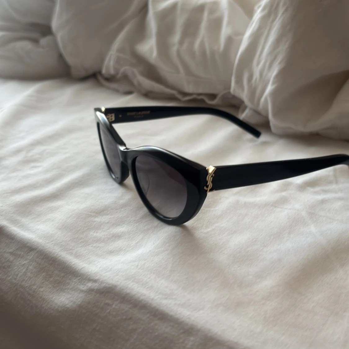 Snygga svarta solglasögon från Saint Laurent i klassisk cat eye-modell. Glasögonen har svarta bågar i plast och mörka linser. Diskret Saint Laurent-logga i guld på sidan. Kommer med originalfodral och förpackning.