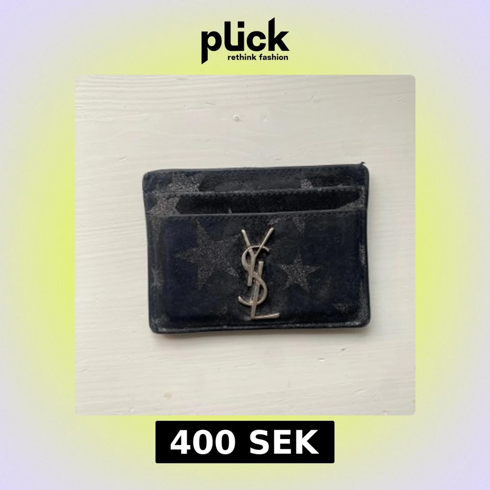 Säljer en svart korthållare från Saint Laurent med glittrigt stjärnmönster och ikoniska YSL-loggan i silver framtill. Perfekt för kort och småsaker, smidig att ha i fickan eller väskan. Sliten men inte trasig!